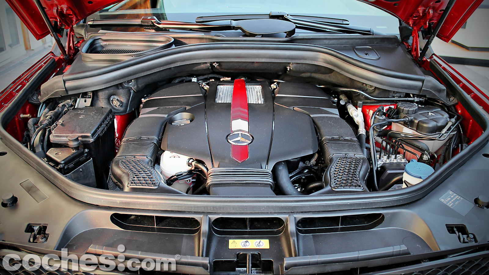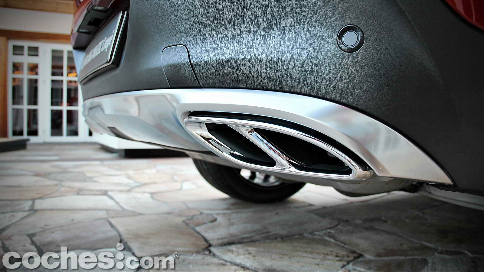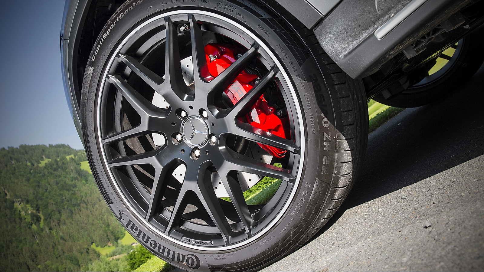 También las no menos impresionantes 4 salidas de escape cromadas o esos anchos pasos de rueda que dan cabida a unas espectaculares llantas AMG de tan sólo 22 pulgadas de diámetro, sobre las que se montan unos no menos descomunales neumáticos Continental SportContact en medidas 285/40 R 22 delante y 325/35 R 22 detrás, o las pinzas de freno de color rojo con el anagrama AMG.