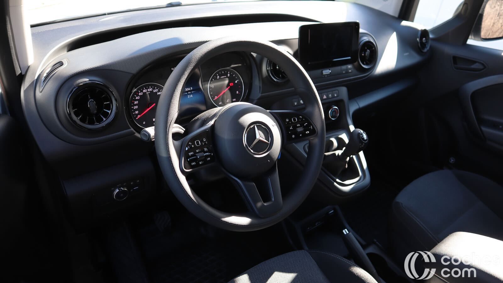 Nada más abrir la puerta los cambios respecto del Citan respecto a su hermano francés son más evidentes. En los últimos tiempos la marca presume de su tecnología y de ese modo lo hace ver en este modelo. Destaca la pantalla central de siete pulgadas (opcional), con el sistema MBUX y compatible con Apple CarPlay y Android Auto mediante cable.