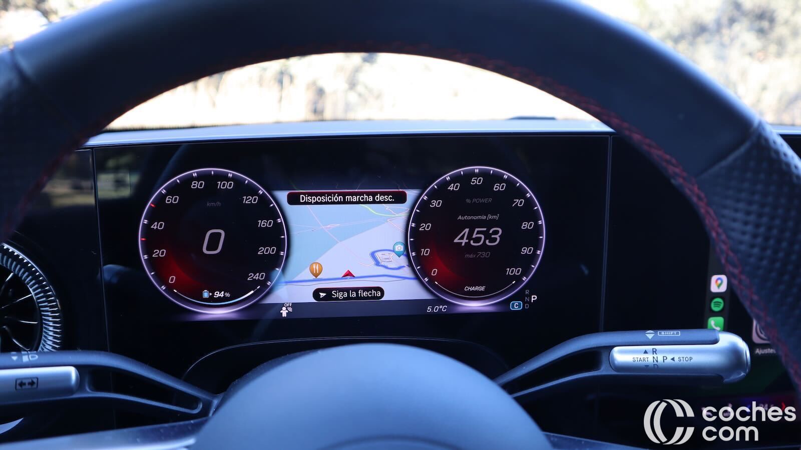 El sistema operativo es el nuevo MB.OS, que integra asistentes de IA de Google Gemini y ChatGPT 4.0. En la práctica, eso significa que el coche entiende preguntas contextuales naturales. “Hola Mercedes. Tengo frío”. Y sube la temperatura. O le puedes preguntar por puntos de recarga próximos y te lleva a los que son compatibles. Funciona muy bien y así no hay que buscar tanto en la pantalla, porque botones hay muy pocos, apenas una barra háptica en la parte inferior del salpicadero, bajo las salidas de aire centrales.