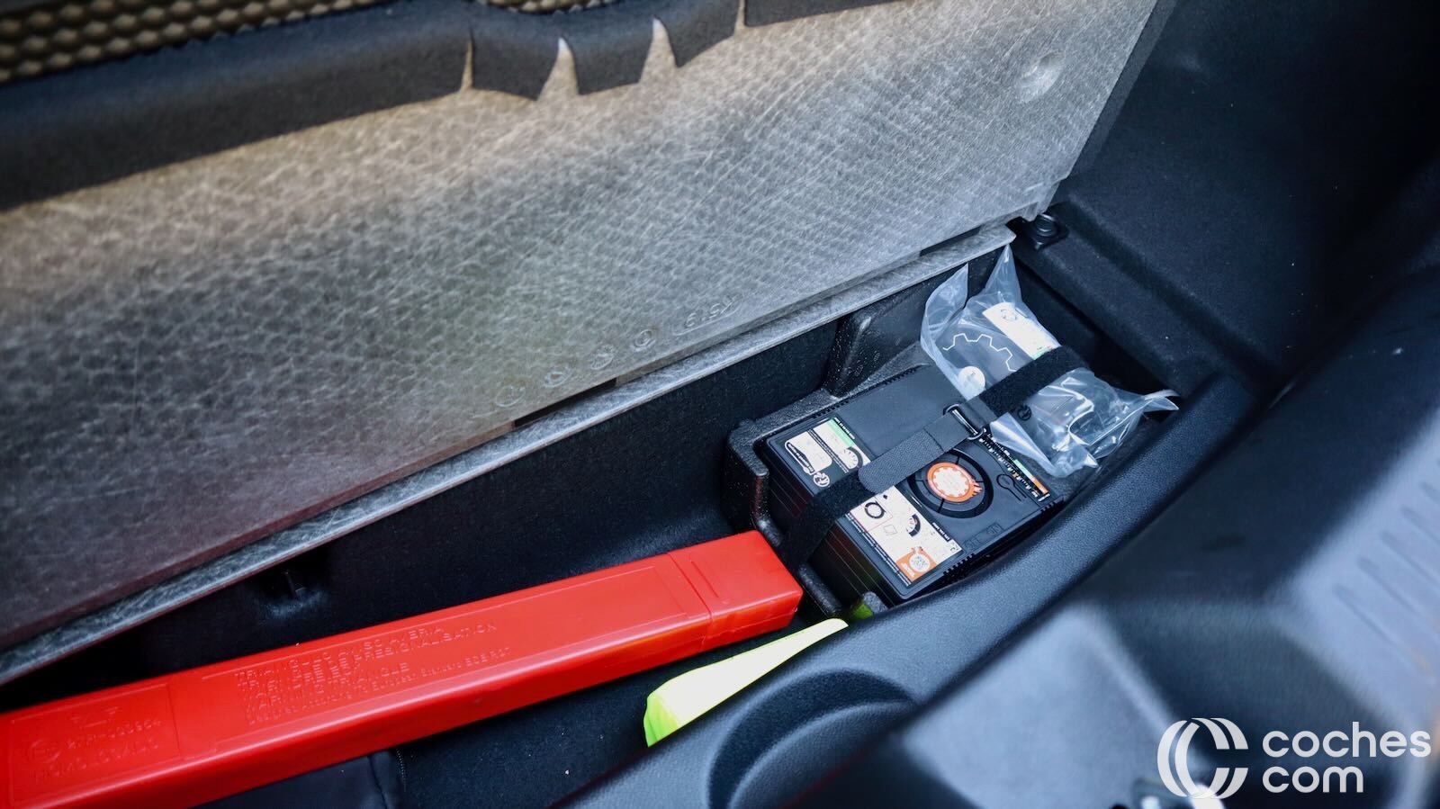 Cuenta, eso sí, con portón de accionamiento eléctrico y un pequeño espacio bajo el piso para triángulos o el kit reparapinchazos. Pocos elementos prácticos, más allá de ganchos para fijar la carga o un hueco con red en el lateral.