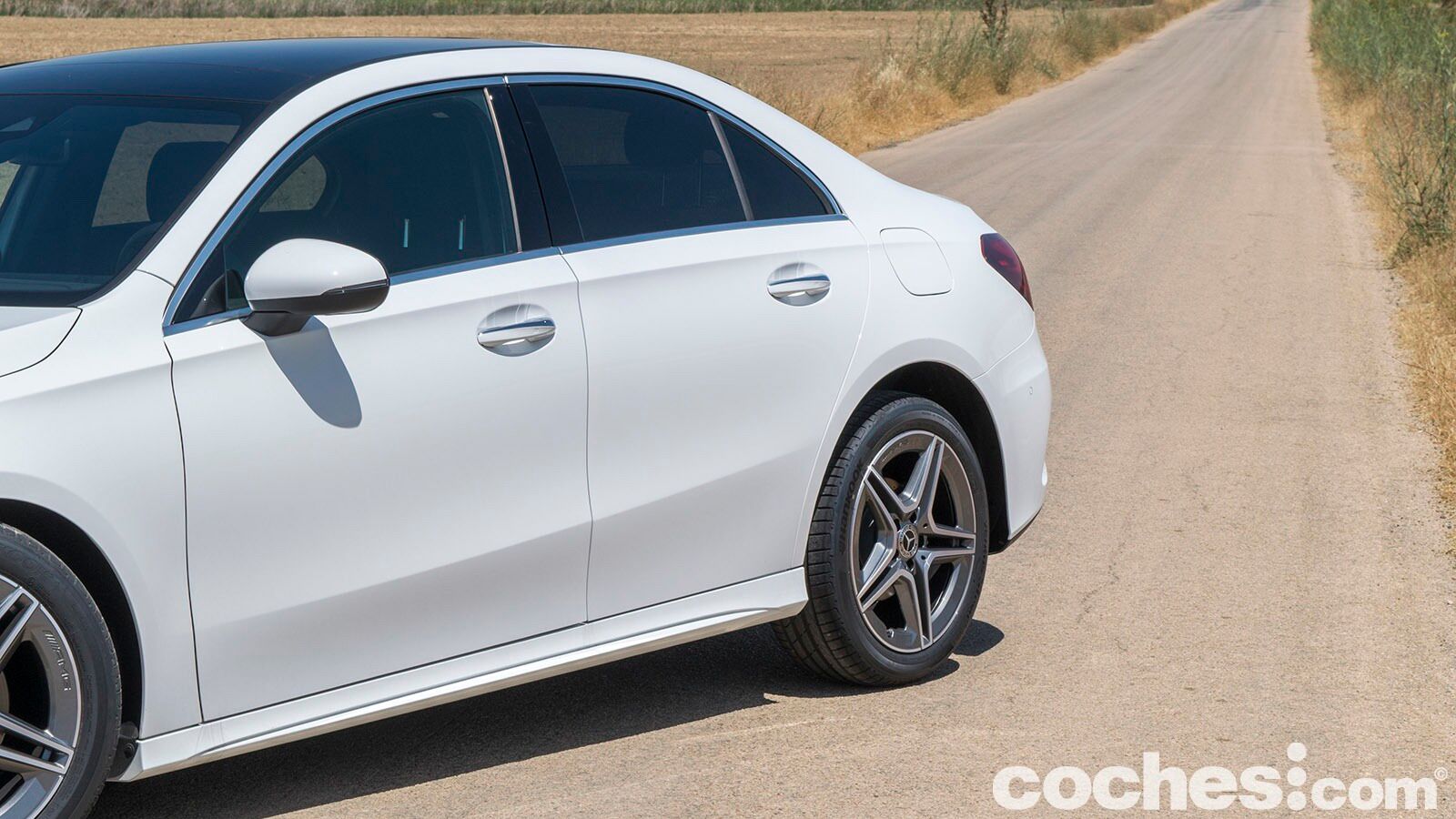 En el lateral de nuestra unidad también veremos algún elemento deportivo, pues se le han montado unas llantas AMG de 19 pulgadas. Por lo demás, vemos una silueta muy conseguida y armónica. Quizás no sea tan dinámica como la del Mercedes CLA, que intenta replicar las formas de un coupé, pero lo cierto es que el tercer volumen queda bien integrado. Además, cuenta con la ventaja de que no se reduzca demasiado la superficie acristalada.
