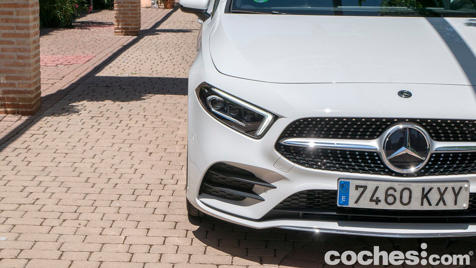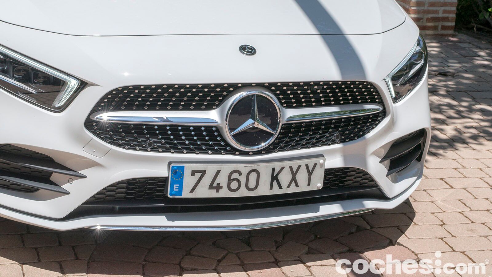 A nivel estético se puede comprobar cómo el lenguaje de diseño se mantiene intacto. El frontal es clavado al del compacto y sigue el estilo que introdujo el Mercedes CLS. Tenemos un morro situado en una posición muy baja en el que el protagonismo recae sobre la parrilla, surcada por un listón cromado y con un llamativo entramado. A ambos lados los nuevos faros LED con luces diurnas con forma de boomerang y por debajo las tomas de aire del paragolpes, correspondientes al paquete AMG Line.