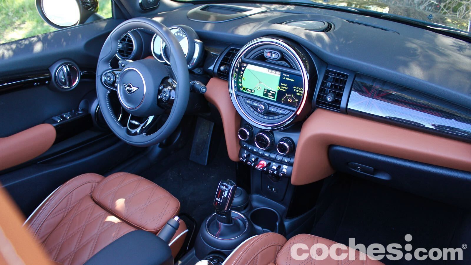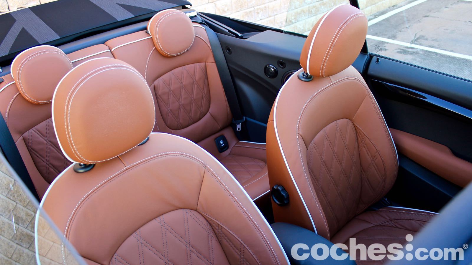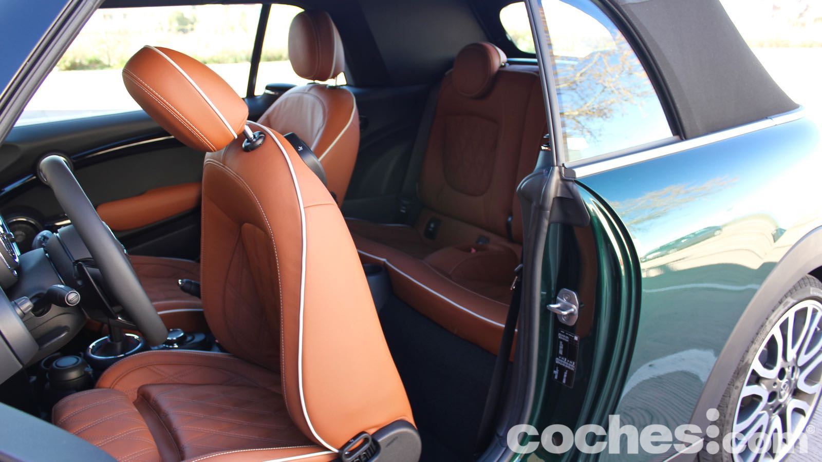 Claro, que hay que contenerse para no mejorar el aspecto con elementos como las llantas de 18 pulgadas bitono (1.300 euros) o la capota con la Union Jack (850 euros). Si además sumas el control de crucero adaptativo, navegador con pantalla de 8,8 pulgadas (compatible con Apple Carplay sin cable), Head Up Display, los asientos tapizados en piel calefactados, el paquete exterior negro, asistente al aparcamiento automático, cámara de visión trasera, posterior, equipo de sonido firmado por Harman Kardon… La cifra se dispara.