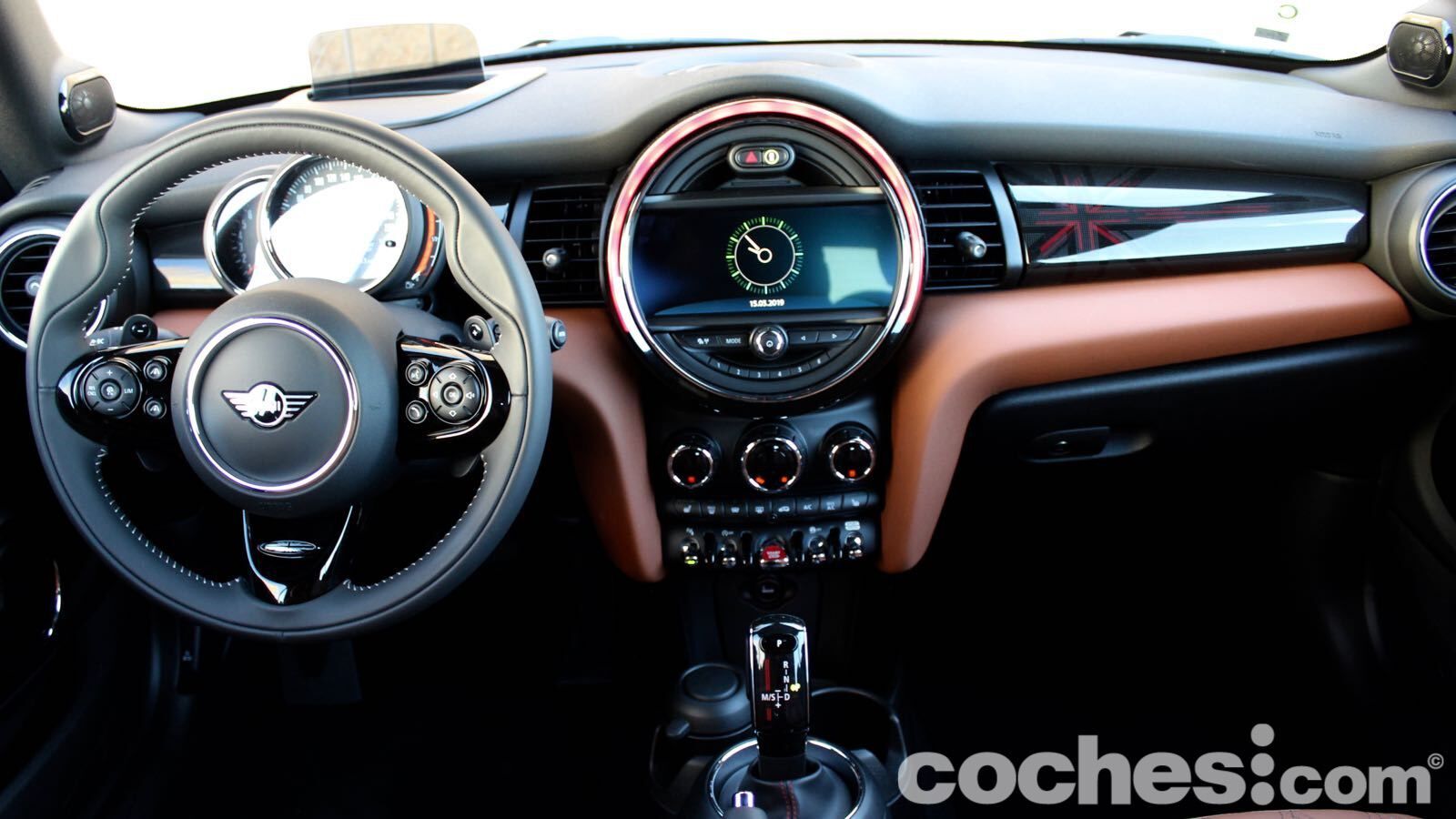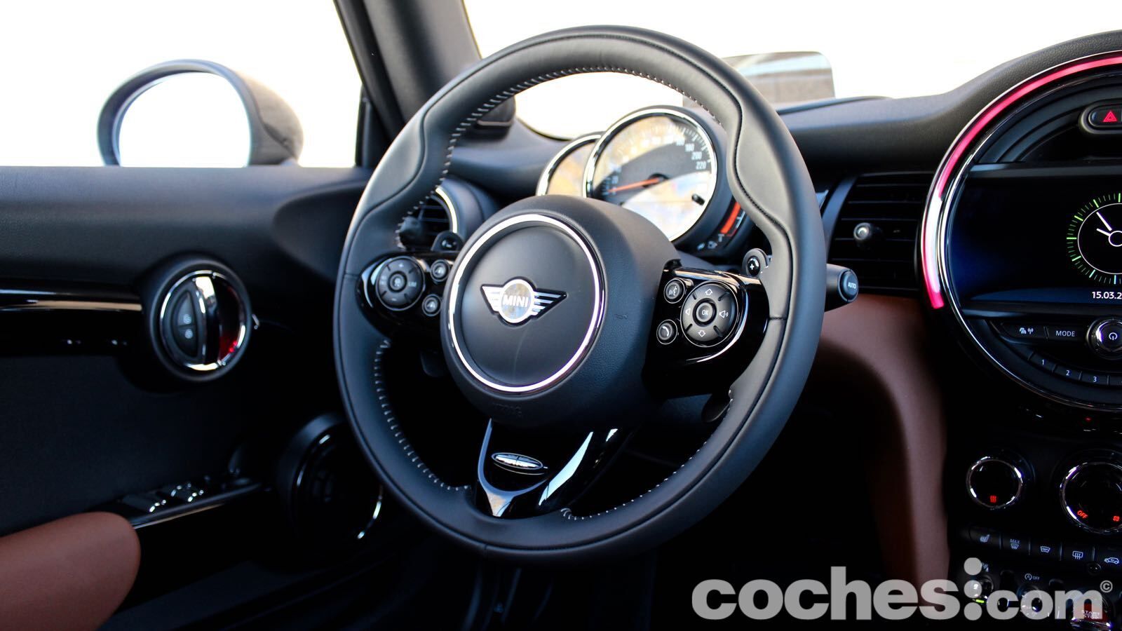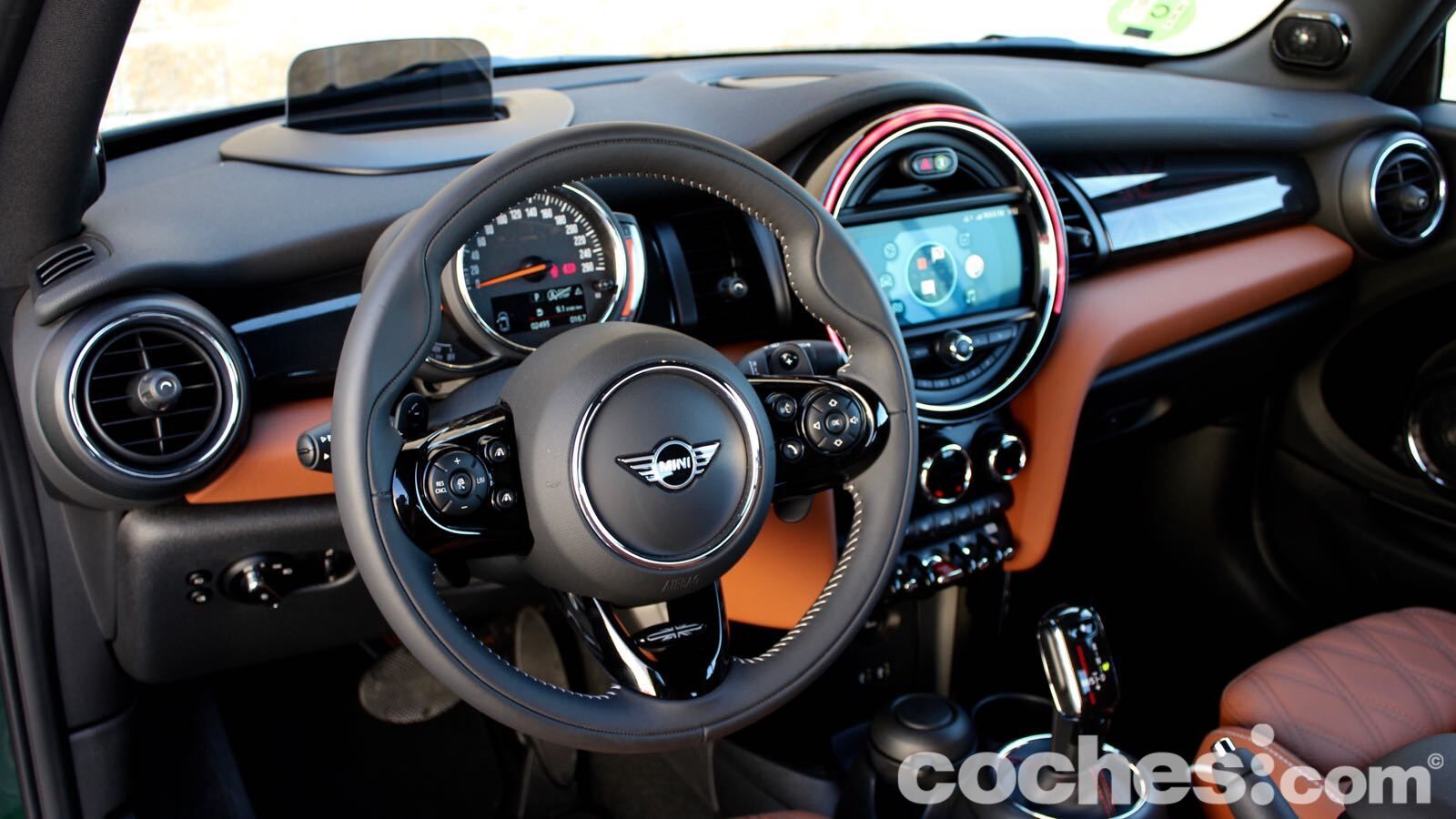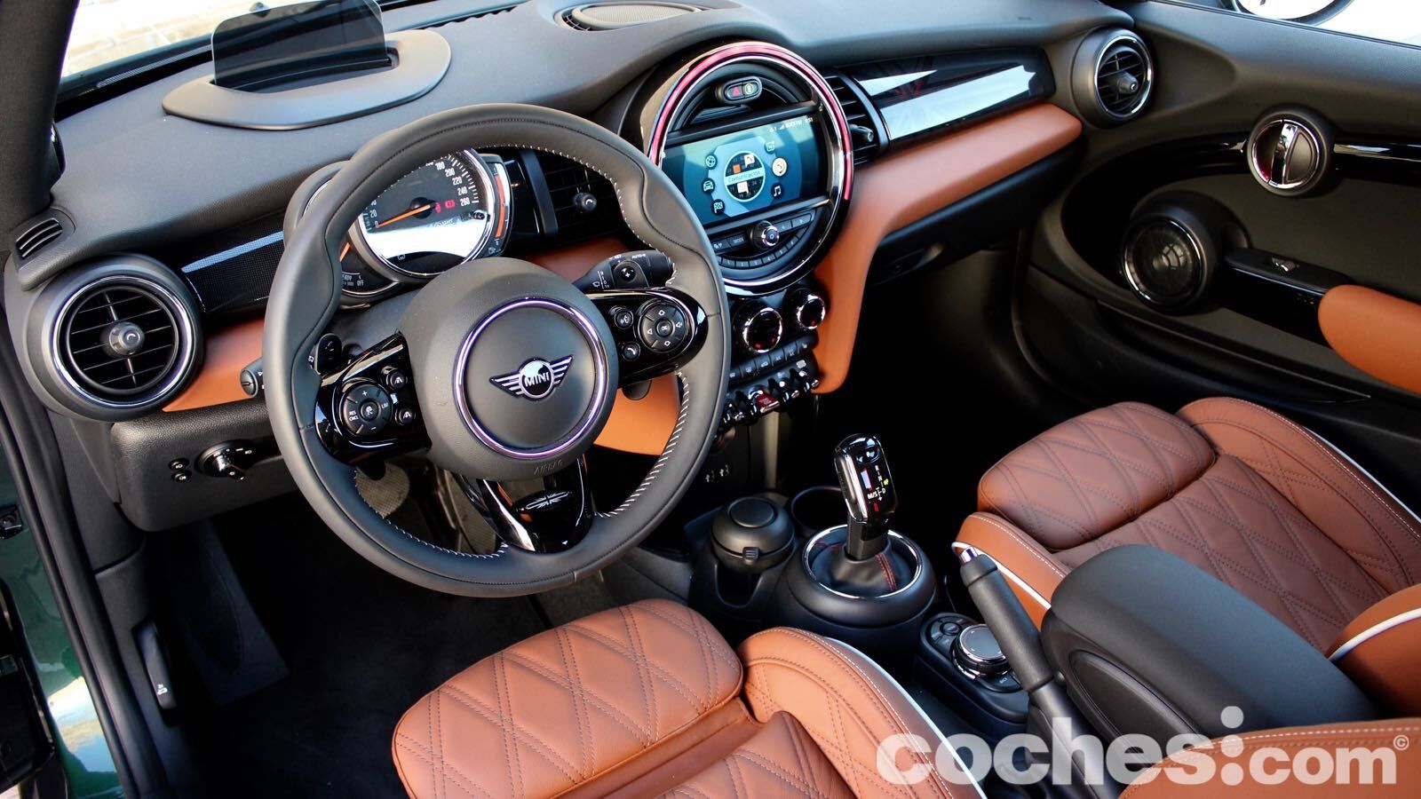 El ejemplo más claro lo tenemos en la tapicería de piel marrón, que combina de maravilla con el verde de la carrocería. Hay también algunas molduras que cuestan un extra (en el lado del copiloto, por ejemplo, hay una retroiluminada que deja ver la bandera británica de nuevo) y el volante deportivo JCW aporta todavía más distinción (lástima del abuso en algunas superficies del material negro piano)
