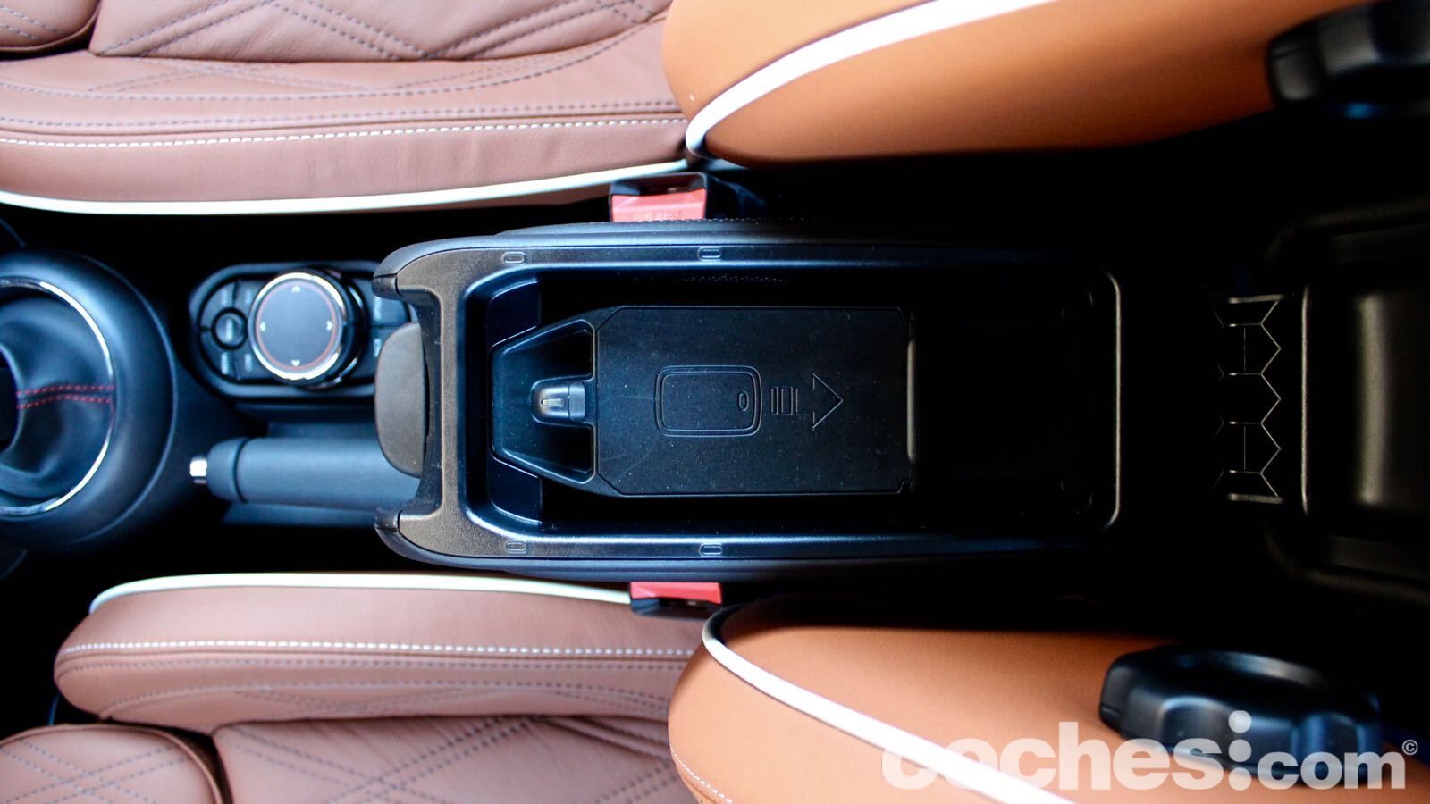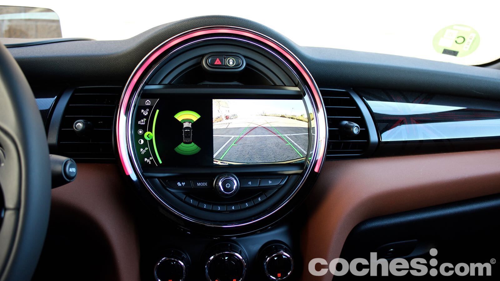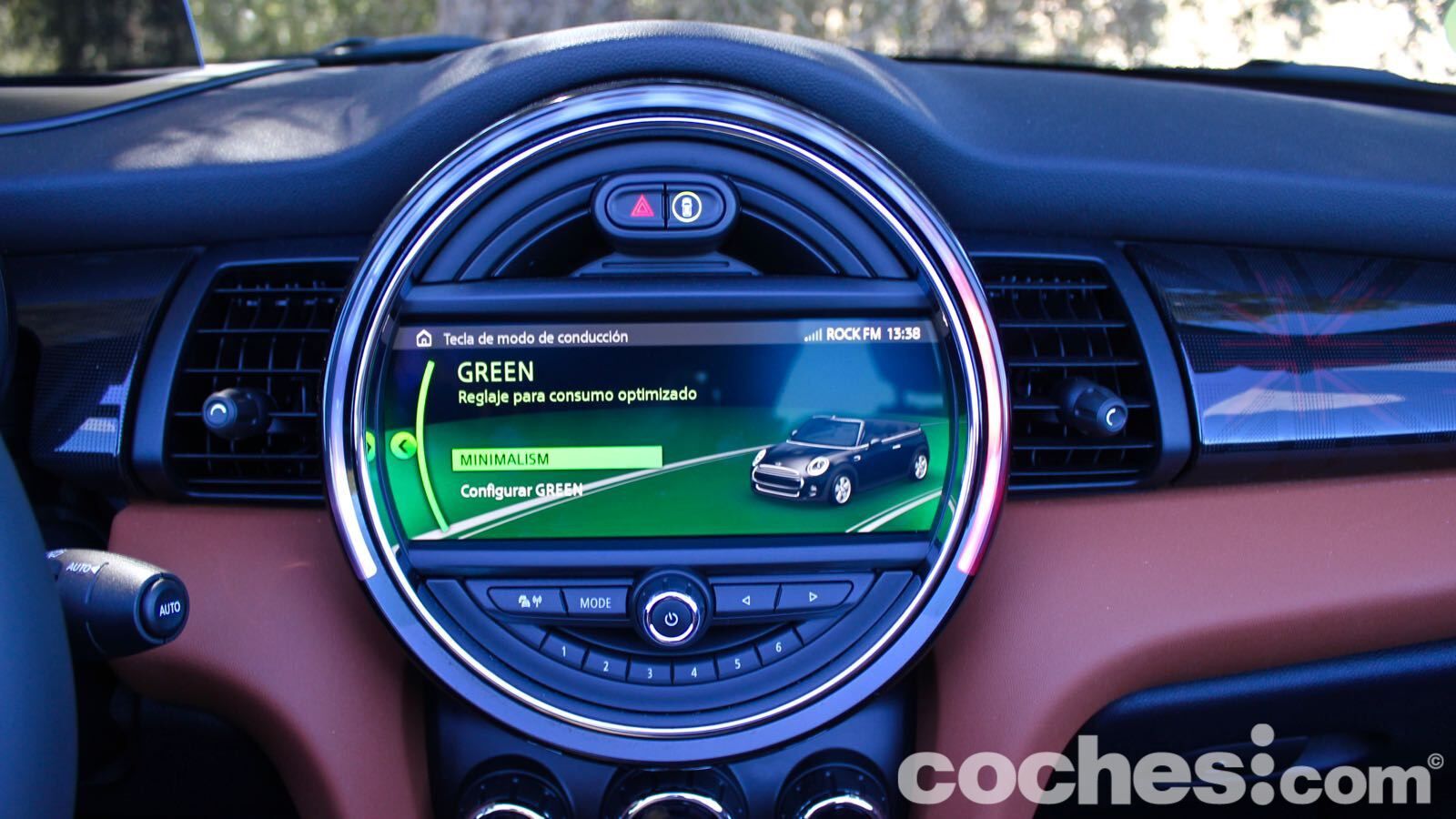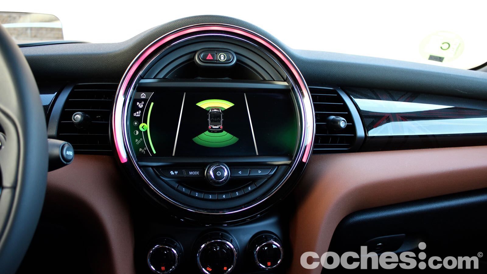 El ejemplo más claro lo tenemos en la tapicería de piel marrón, que combina de maravilla con el verde de la carrocería. Hay también algunas molduras que cuestan un extra (en el lado del copiloto, por ejemplo, hay una retroiluminada que deja ver la bandera británica de nuevo) y el volante deportivo JCW aporta todavía más distinción (lástima del abuso en algunas superficies del material negro piano)
