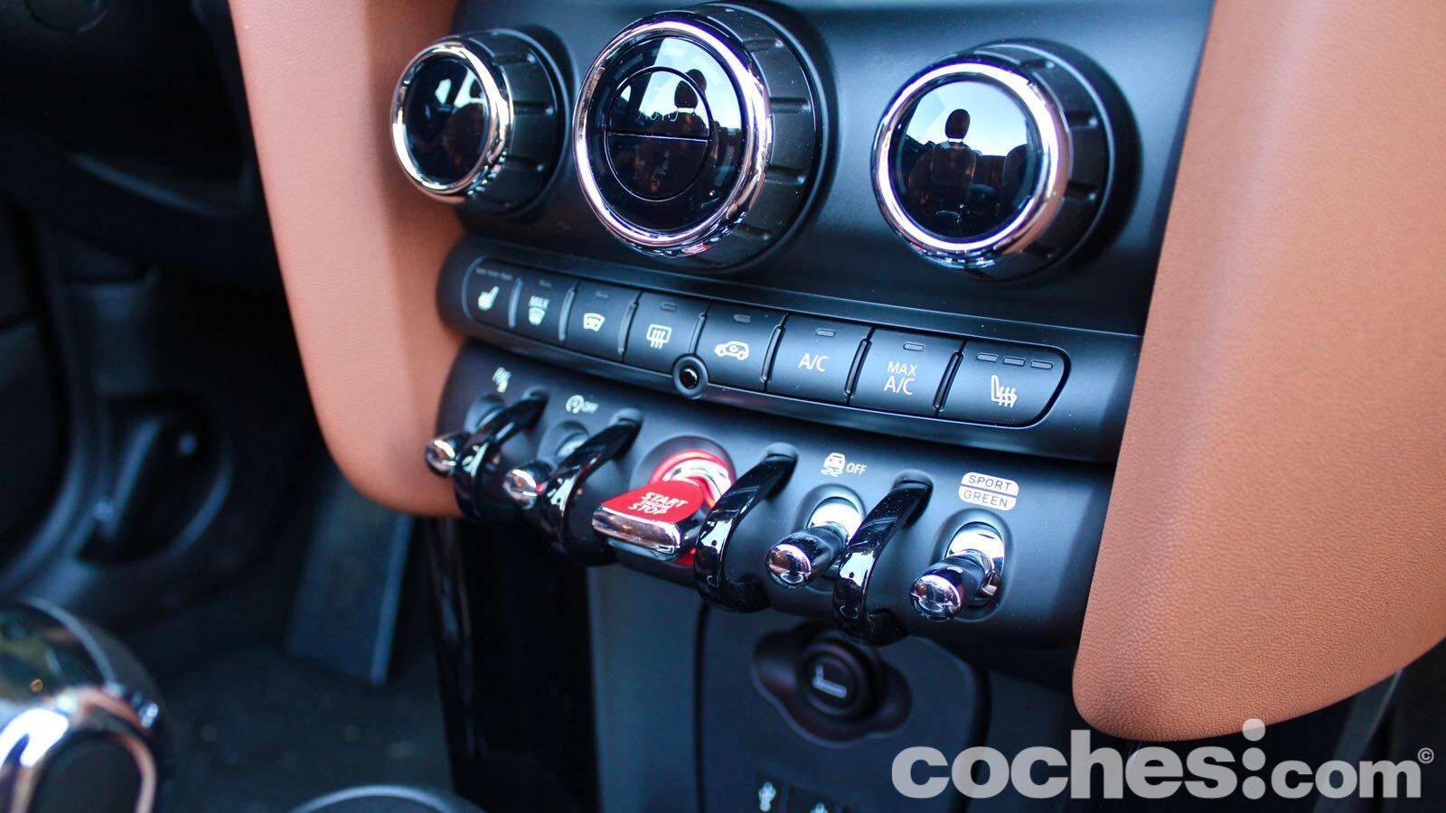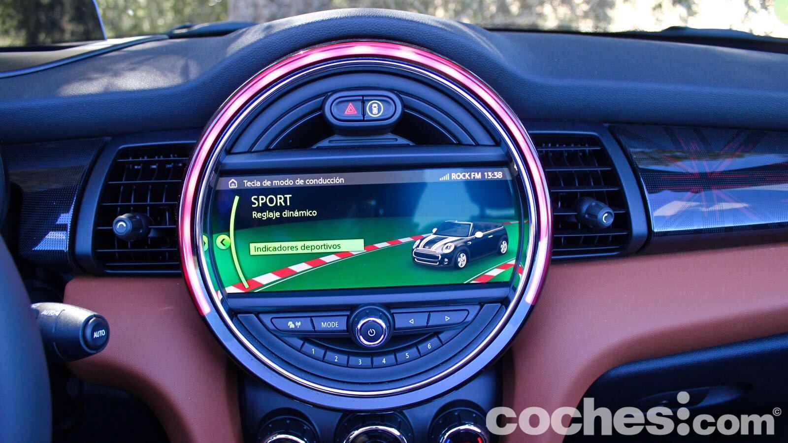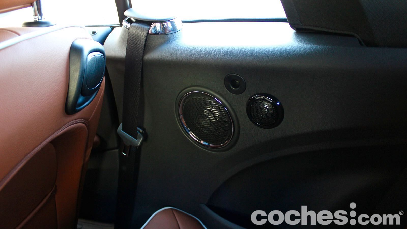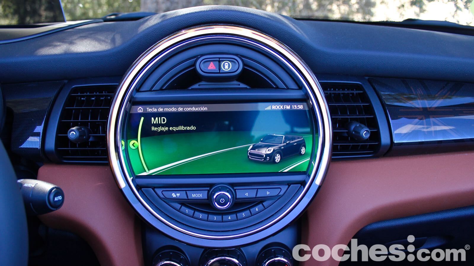 El ejemplo más claro lo tenemos en la tapicería de piel marrón, que combina de maravilla con el verde de la carrocería. Hay también algunas molduras que cuestan un extra (en el lado del copiloto, por ejemplo, hay una retroiluminada que deja ver la bandera británica de nuevo) y el volante deportivo JCW aporta todavía más distinción (lástima del abuso en algunas superficies del material negro piano)
