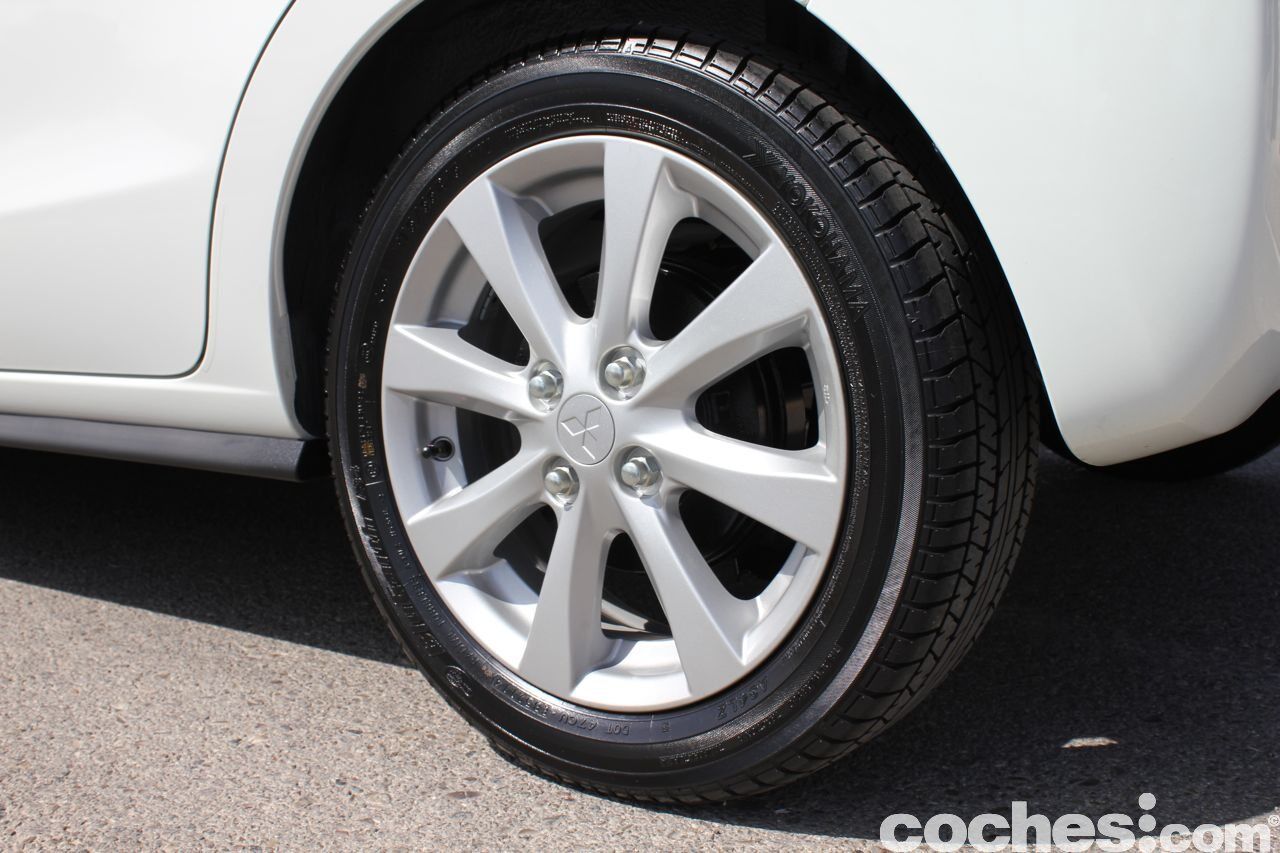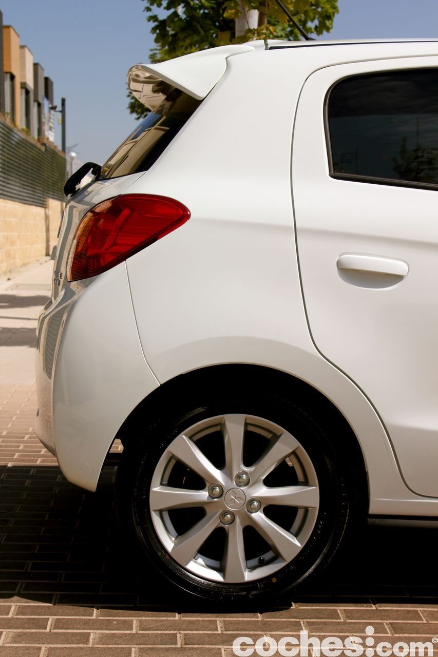 Nuestra unidad contaba con llantas de 15 pulgadas, que distinguen al nivel de equipamiento superior y algún detalle más como los cristales tintados. Por cierto, en el mercado español solamente podrá elegirse con cuatro colores para la carrocería: blanco, rojo metalizado, gris perlado y negro perlado (en otros mercados hay hasta ocho tonos, incluido un verde muy llamativo, como puedes ver en la galería de fotos del Space Star).