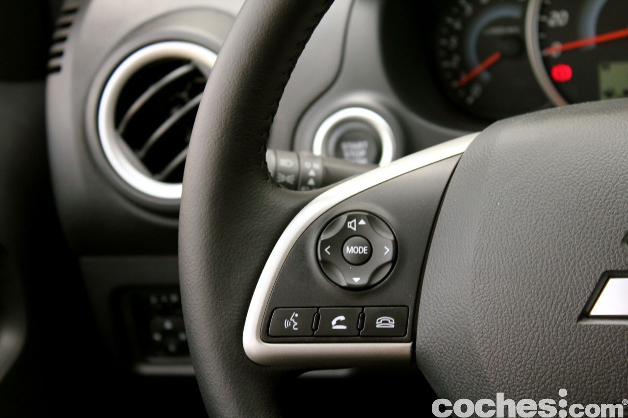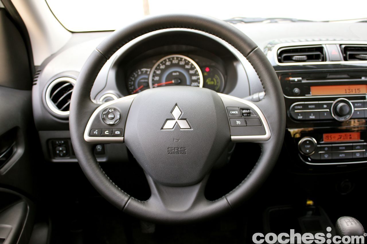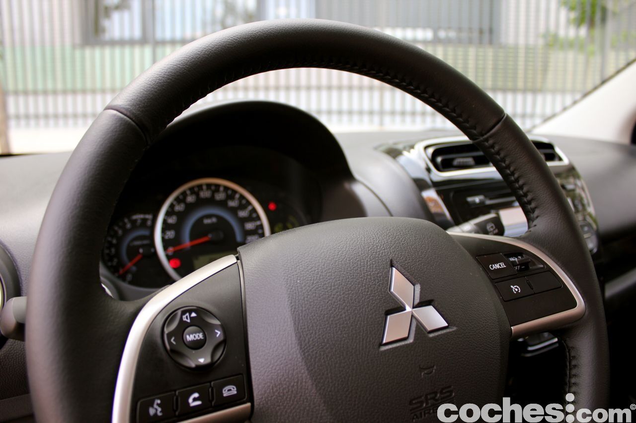 Una vez dentro del coche empiezan las sorpresas. Para empezar, nos encontramos con bastantes elementos que podemos ver en otros modelos de la marca. Un ejemplo: equipa el mismo volante multifunción que el Mitsubishi Outlander... algo impropio de un segmento A, la verdad. Eso sí, no es regulable en profundidad (sí en altura). Yo no tuve problemas para encontrar una situación de conducción óptima y nuestro compañero en esta prueba tampoco, pero sí es posible que alguien más alto los tenga.