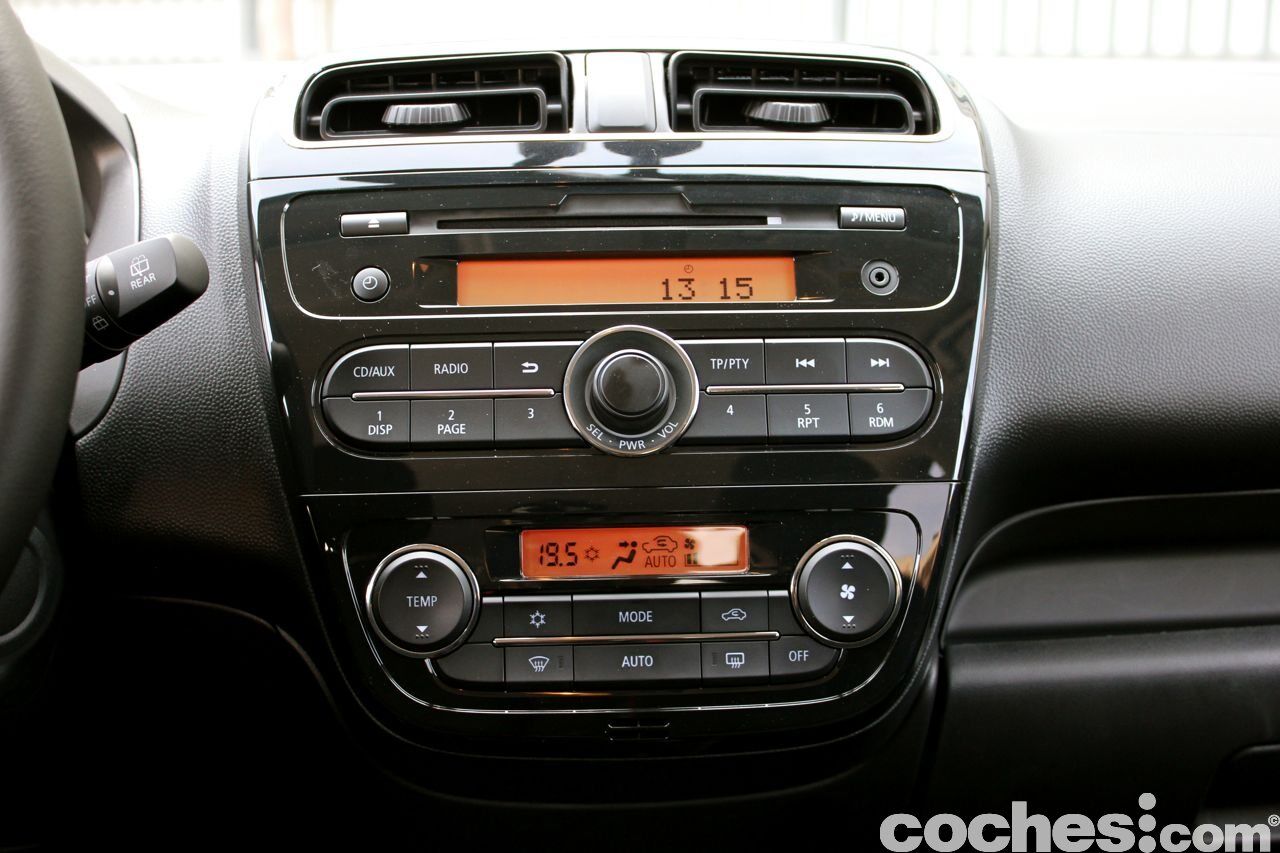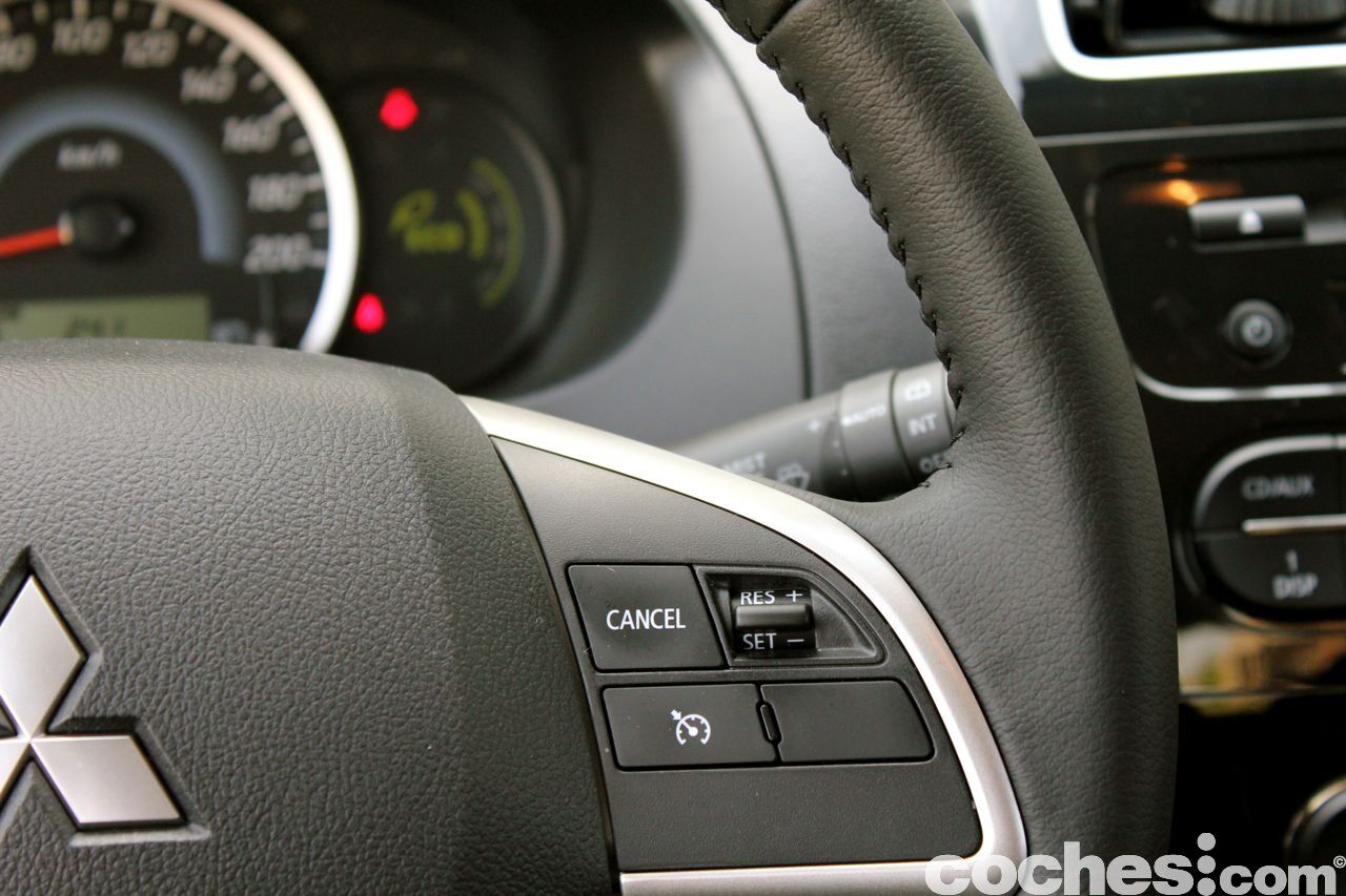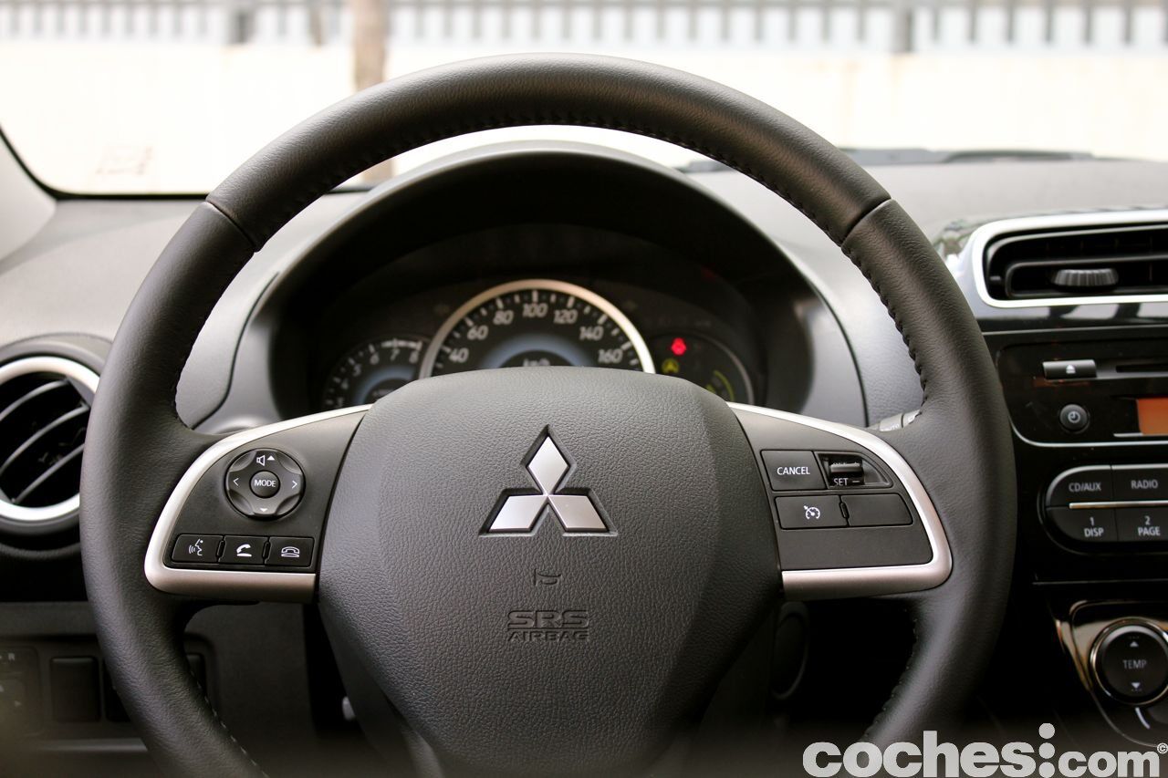 Una vez dentro del coche empiezan las sorpresas. Para empezar, nos encontramos con bastantes elementos que podemos ver en otros modelos de la marca. Un ejemplo: equipa el mismo volante multifunción que el Mitsubishi Outlander... algo impropio de un segmento A, la verdad. Eso sí, no es regulable en profundidad (sí en altura). Yo no tuve problemas para encontrar una situación de conducción óptima y nuestro compañero en esta prueba tampoco, pero sí es posible que alguien más alto los tenga.