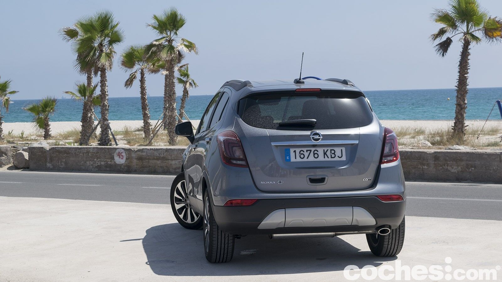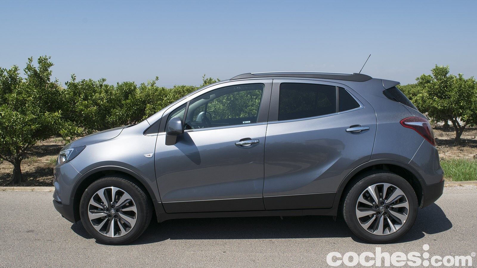 Visto de perfil apenas hay cambios. El Opel Mokka X sigue teniendo esa imagen campera gracias a los plásticos negros que recubren los bajos de la carrocería y a unas barras del techo discretas. Nuestra unidad lleva unas llantas de 18 pulgadas que también son de nuevo diseño. Para enriquecer la personalización, la paleta de colores recibe nuevos tonos.