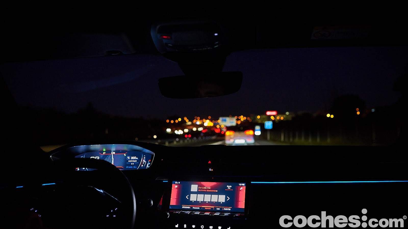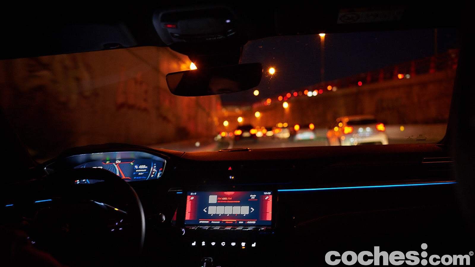 El i-Cockpit de Peugeot es lo primero que nos llama la atención nada más acceder al habitáculo. Este elemento que viene de serie desde el acabo de acceso, le da un toque futurista al habitáculo y muestra de manera sobresaliente toda la información del vehículo. Asimismo, dispone de varias interfaces para mostrar los datos de manera diferente. Desde poner el cuentakilómetros “analógico”, hasta la navegación a pantalla completa, estado de los sistemas de seguridad y la cámara de visión nocturna con detector de peatones. Este último, fiel imagen del avance tecnológico que ha experimentado Peugeot en los últimos tiempos.