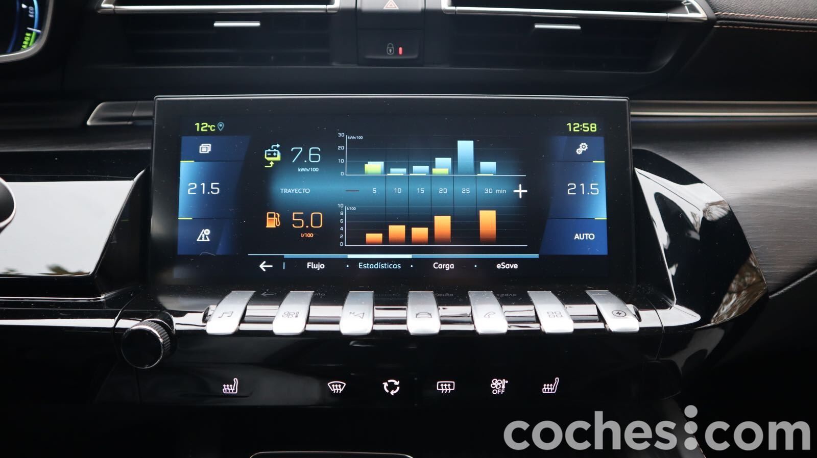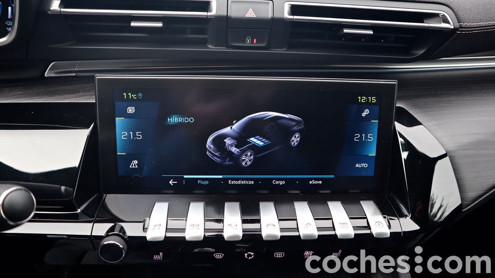 En segundo lugar, concentra muchas funciones, como la climatización, que obligan a dar varios toques en ella para una función tan sencilla como subir y bajar un par de grados la temperatura. Bajo la pantalla hay un mando giratorio para el volumen y unas teclas que te permiten un acceso rápido (ordenadas según la marca por un mayor o menor uso). Esta versión Hybrid tiene una específica para controlar el sistema híbrido.