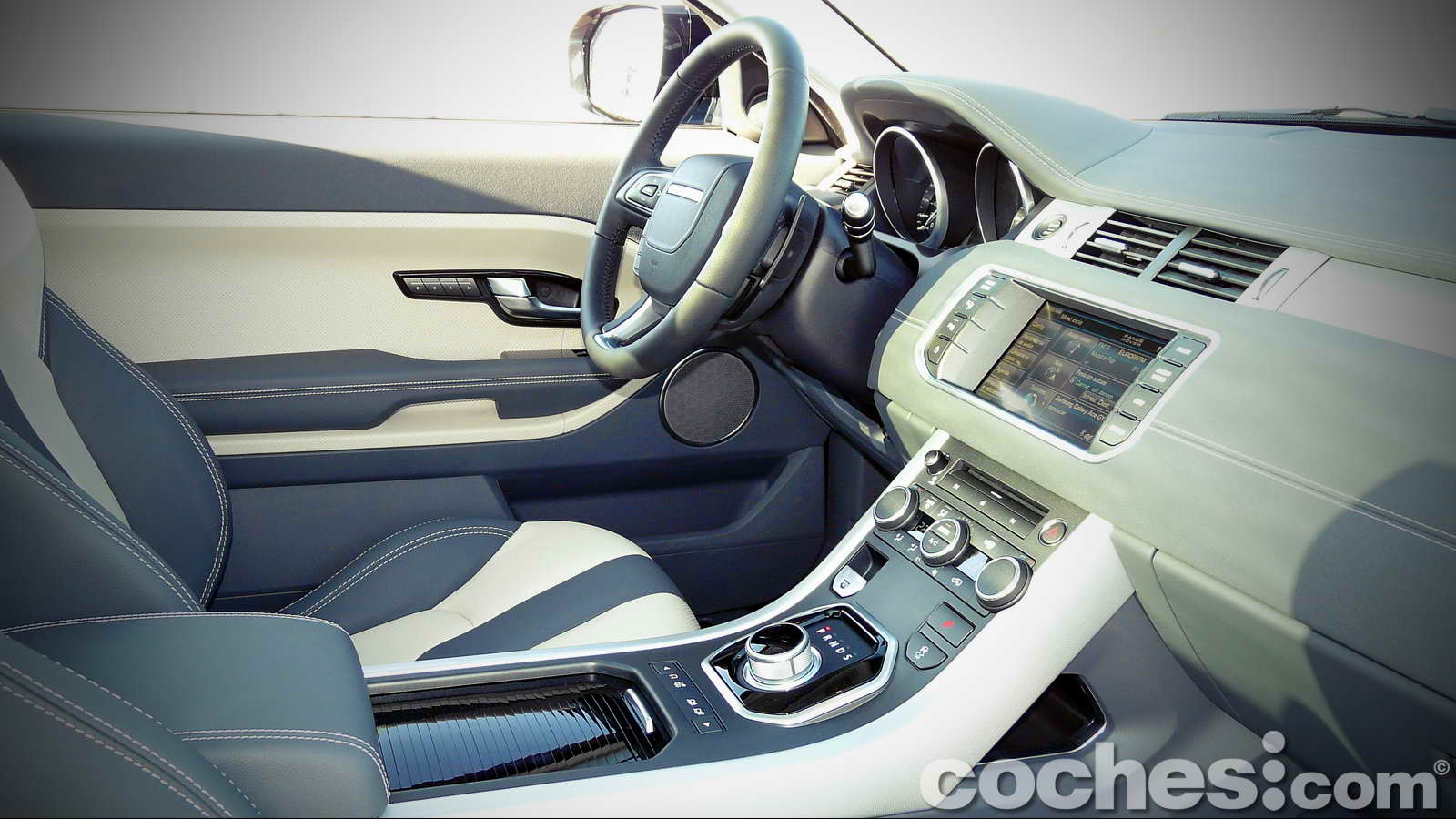 Lo que nos encontramos una vez franqueamos la puerta es un ambiente sumamente agradable, con un diseño actual, pero quizá no tan “rompedor” como la estética exterior nos haría imaginar. La calidad percibida es fantástica, como en todo Range Rover que se precie de tal. Los ajustes son simplemente sensacionales y los materiales empleados solamente pueden recibir un sobresaliente. En esta ocasión la combinación de colores que equipaba la versión probada recibe la denominación “Ivory/Lunar”, que le otorga una gran luminosidad (pese al pequeño tamaño de las ventanas) incluso sin abrir el inmenso techo panorámico de cristal.