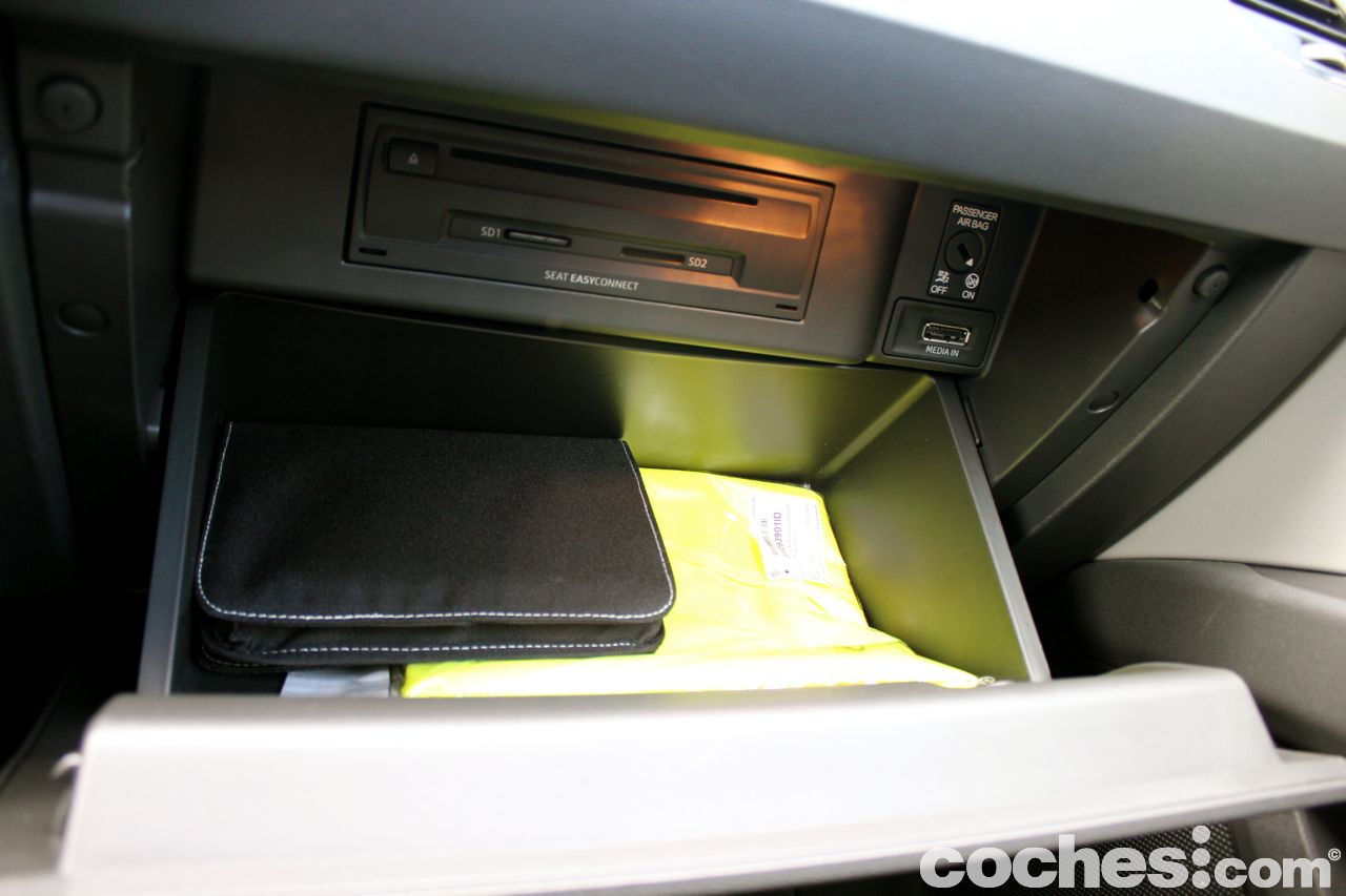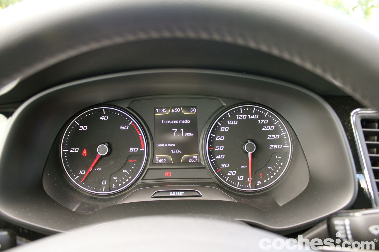 En el cuadro de mandos hay los dos típicos relojes (velocímetro y cuentarevoluciones), con una pantalla entre ambos desde la que se pueden controlar casi todas las funciones del coche. Se controla desde los mandos situados en el volante multifunción y puedes ir viendo las indicaciones del navegador, equipo de audio, consumos totales o parciales, temperaturas de agua y aceite, datos del viaje... Todo ello sin tener que desviar la vista hacia la consola central. Es una solución presente en todos los vehículos del Grupo Volkswagen desde hace tiempo y que funciona.