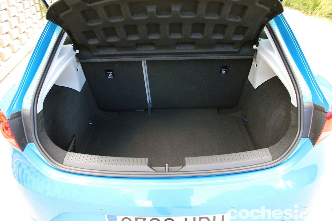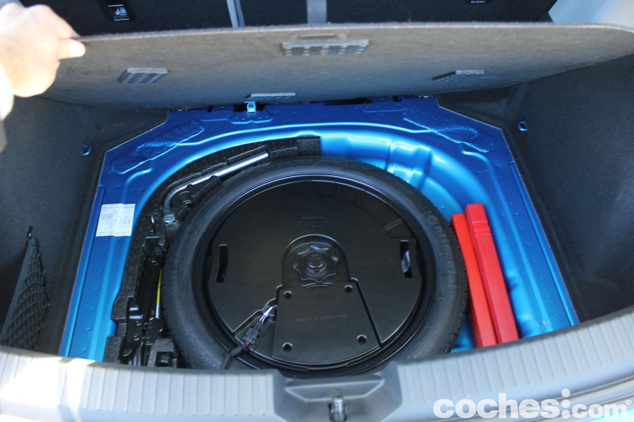 El maletero está iluminado, pero no cuenta con una toma de corriente. Lo que sí cuenta es con dos ganchos en las paredes para colgar bolsas o una mochila. Los respaldos de los asientos traseros son abatibles, por partes, con lo que se logran 1.150 litros de capacidad. Eso sí, el piso no queda totalmente liso, sino que queda un pequeño escalón con el suelo del maletero. Bajo el piso del maletero encontramos con una rueda de respuesto de galleta. Luego pudimos comprobar que no se incluye de serie. Hay que pagar un pequeño sobrecoste de 49 euros.