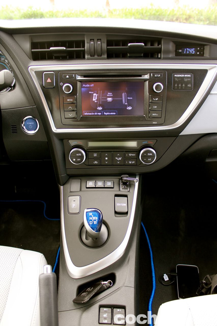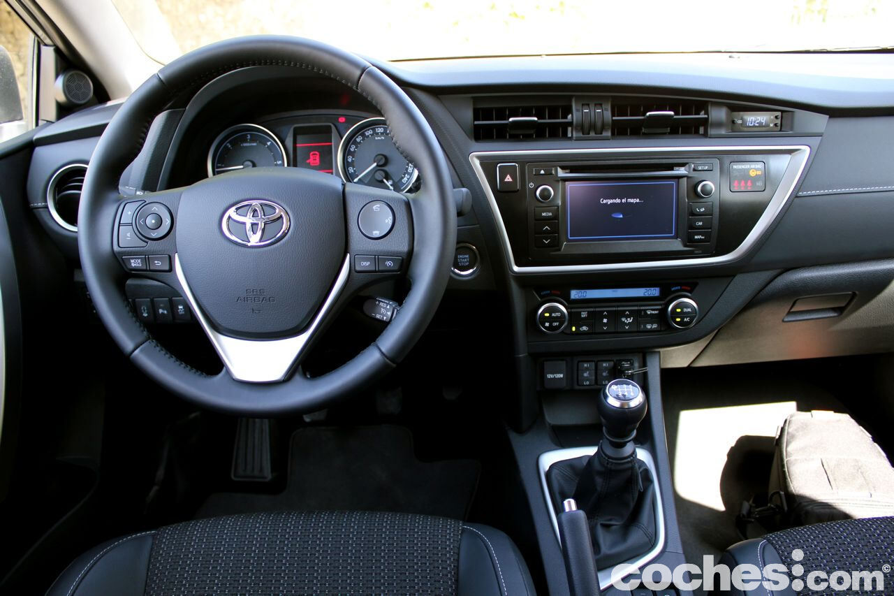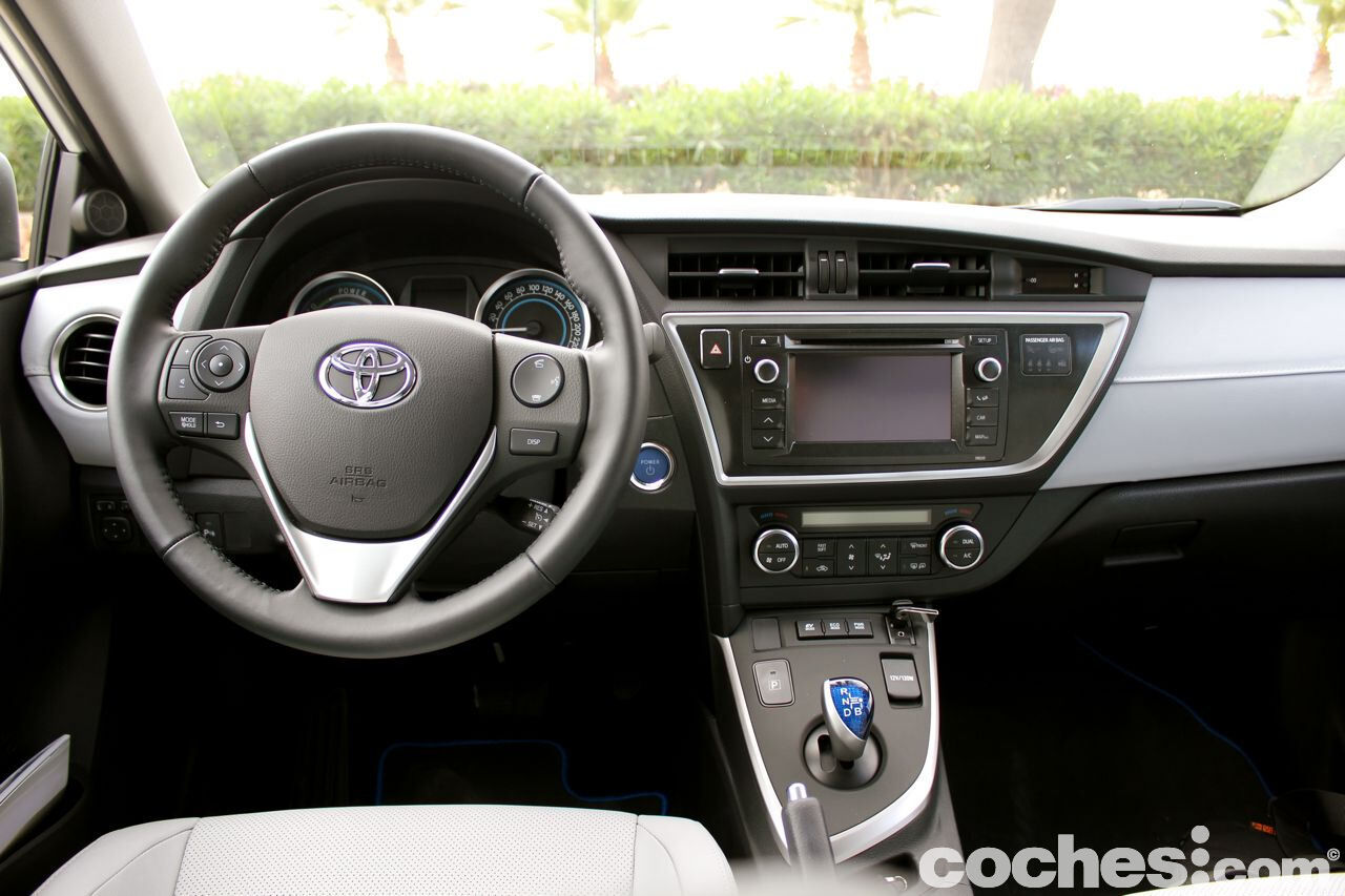Lo primero que llama la atención del interior es lo vertical que es todo. Todos los mandos están al alcance del conductor. Hay diferencias entre la versión híbrida. Cuenta con un indicador que ayuda a la conducción ecológica (en lugar del cuentarevoluciones), a la izquierda del velocímetro. La consola también cambia, al estar dominada por el mando del cambio, en el azul Toyota. Por su parte, la consola de una versión con cambio manual tiene más espacio disponible, con un pequeño hueco para dejar objetos.