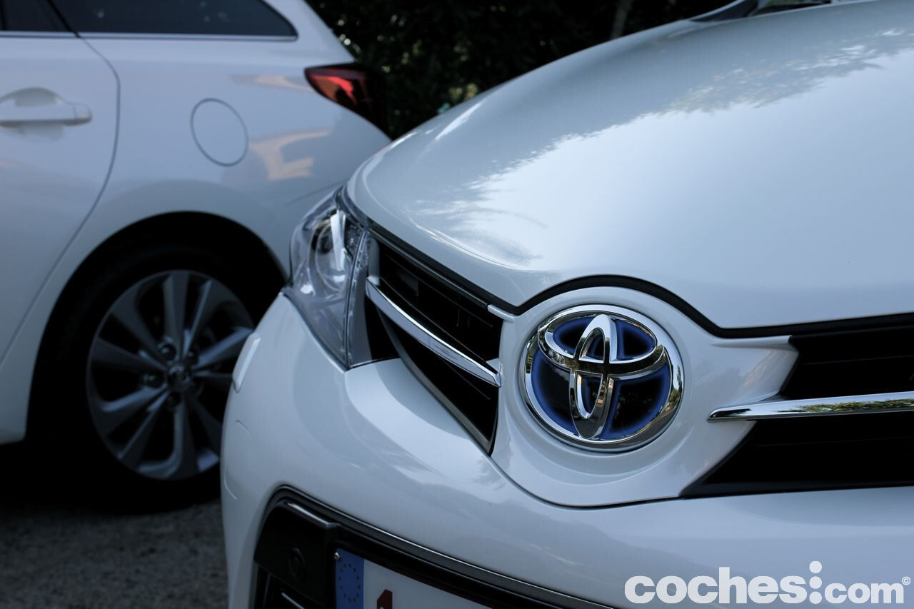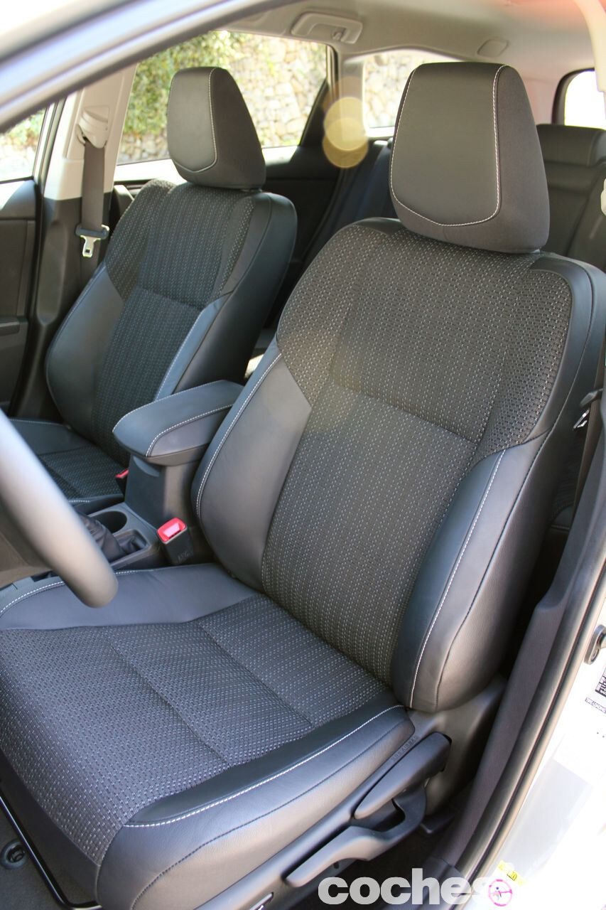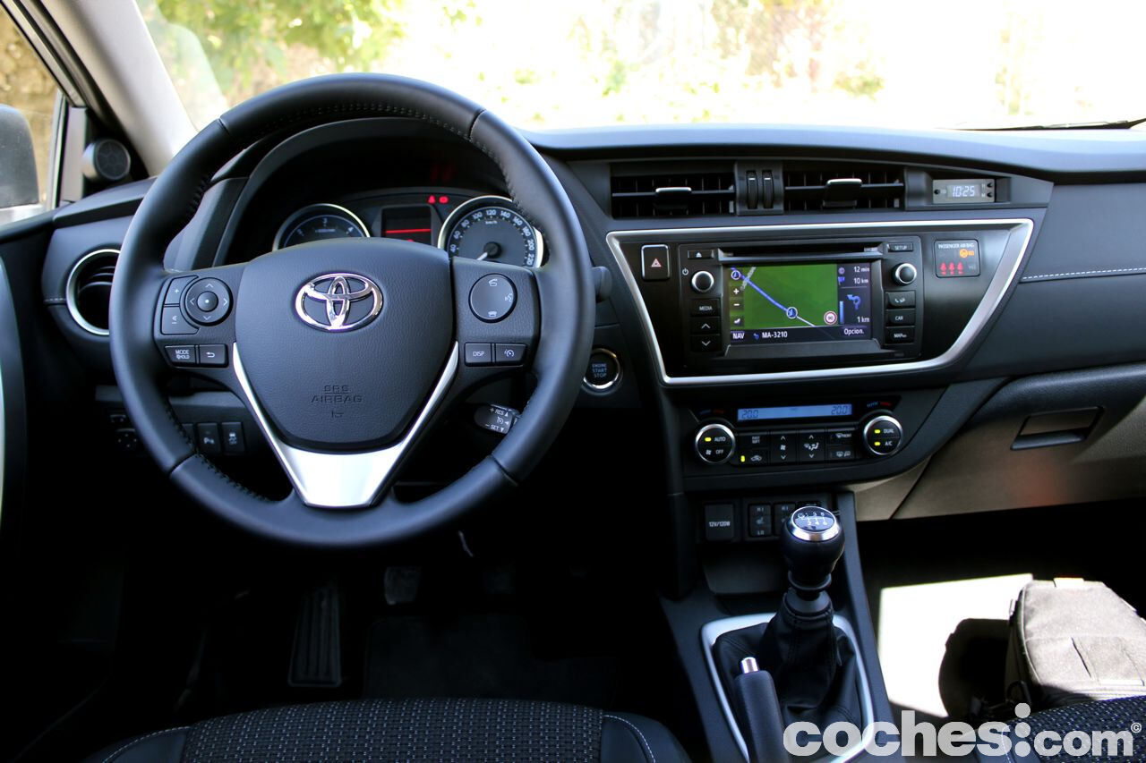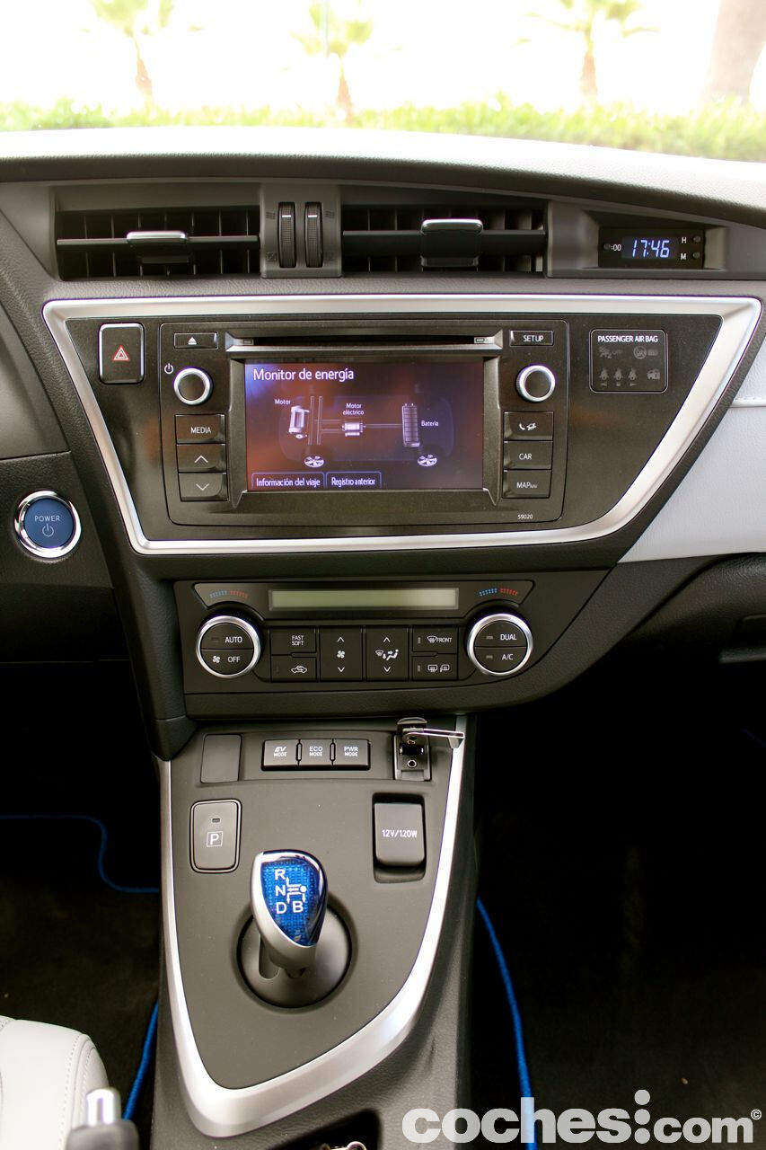 Lo primero que llama la atención del interior es lo vertical que es todo. Todos los mandos están al alcance del conductor. Hay diferencias entre la versión híbrida. Cuenta con un indicador que ayuda a la conducción ecológica (en lugar del cuentarevoluciones), a la izquierda del velocímetro. La consola también cambia, al estar dominada por el mando del cambio, en el azul Toyota. Por su parte, la consola de una versión con cambio manual tiene más espacio disponible, con un pequeño hueco para dejar objetos.