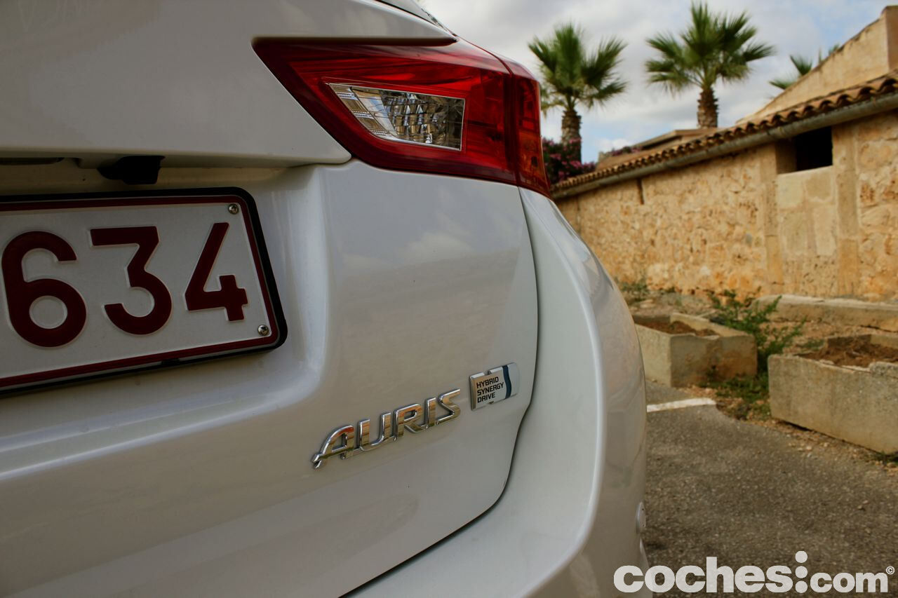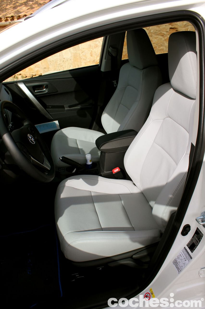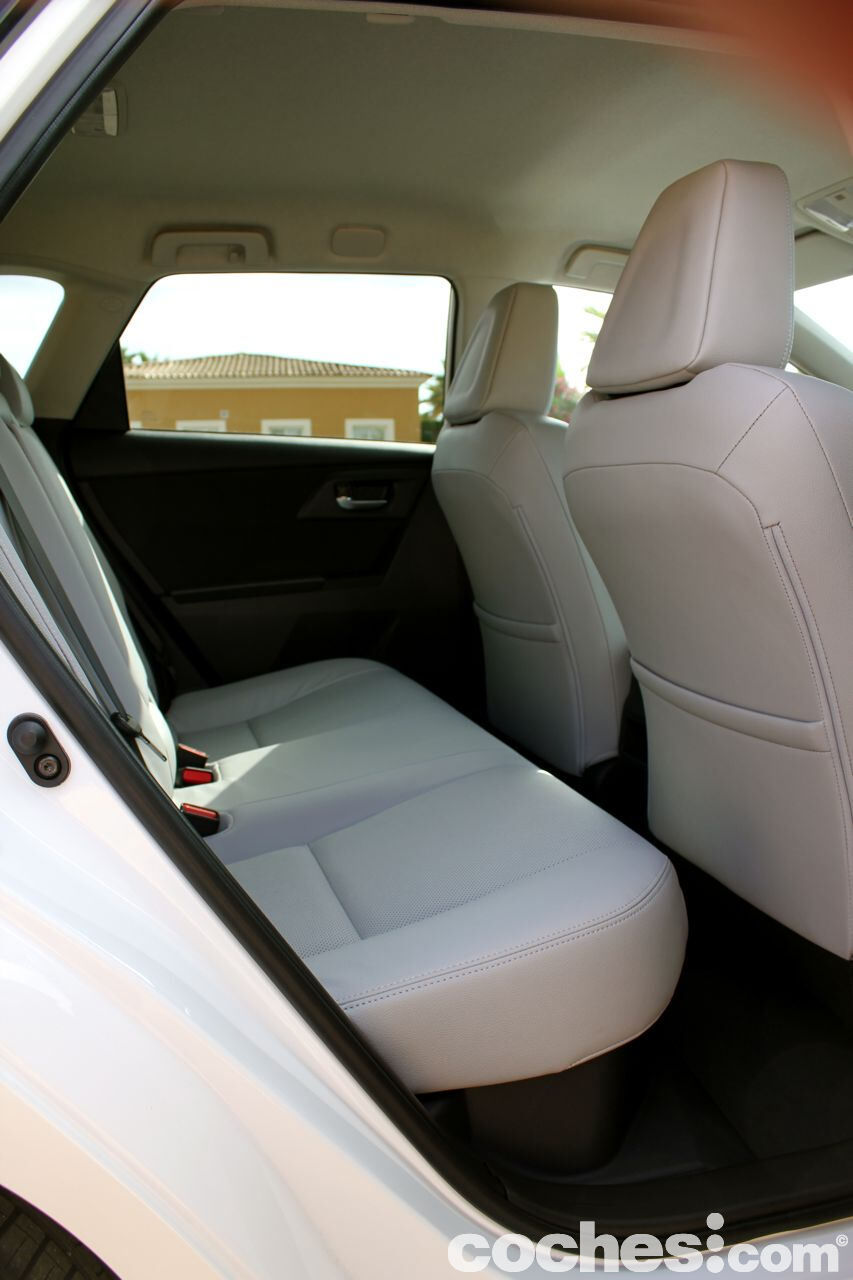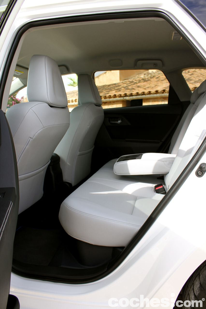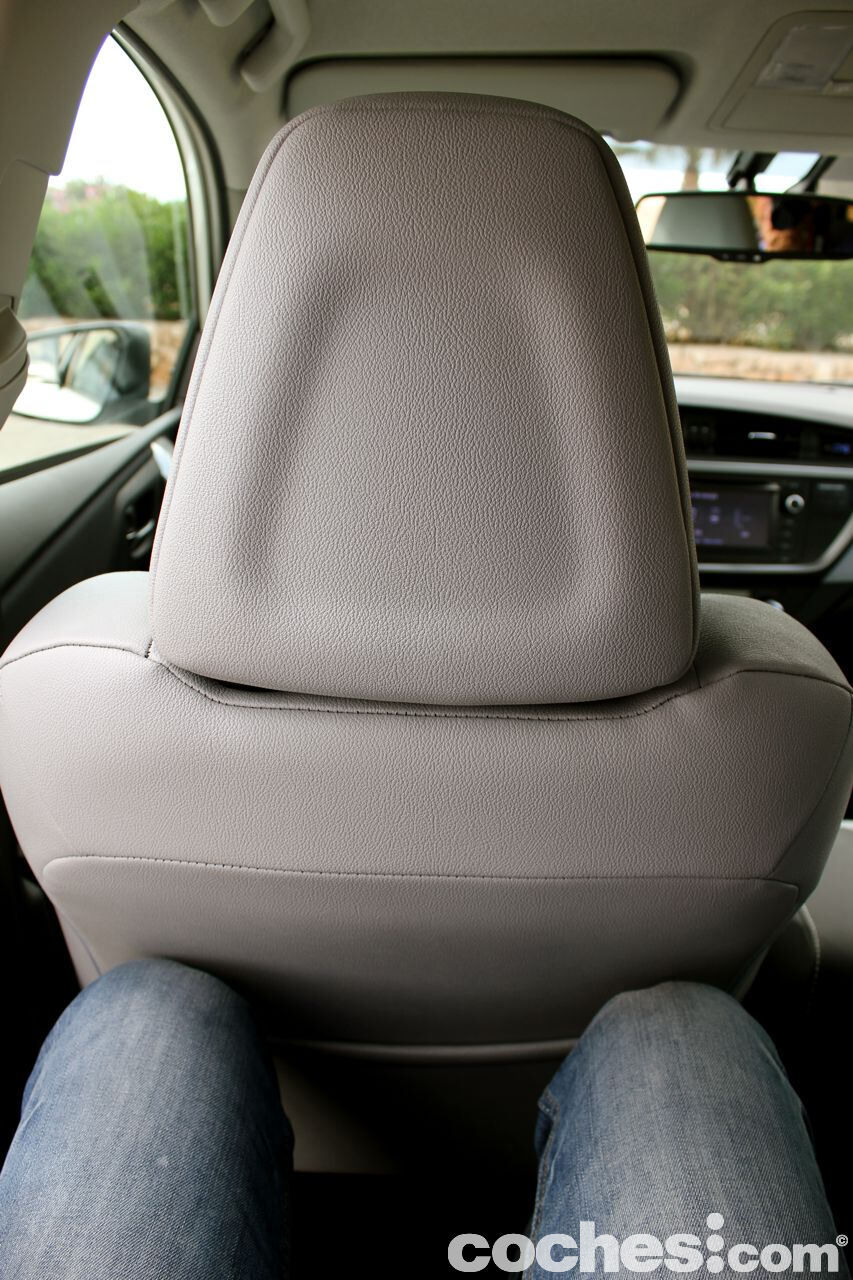 En lo referente al espacio disponible, la habitabilidad en las plazas delanteras es muy buena. Los asientos de la unidad hibrida que probamos son un extra, de cuero gris claro, exclusiva de la versión con este motor. No cambia respecto a un Auris convencional. Detrás, como cualquier otro compacto, es algo justo para tres personas... pero la altura libre hasta el techo es buena (podría parecer lo contrario viendo lo bajo que es el coche) y el espacio para las piernas, correcto para un coche de su tamaño.