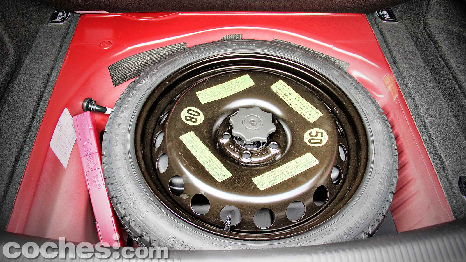 Una vez levantamos el piso del maletero aparecerá ante nosotros una rueda de repuesto de uso temporal en medidas T 125/70 R19, también de la marca Continental, con la que podremos rodar como máximo a 80 km/h hasta encontrar un taller donde nos reparen el neumático dañado. Tampoco falta, en el hueco de esta rueda, el gato y una reducida dotación de herramientas.