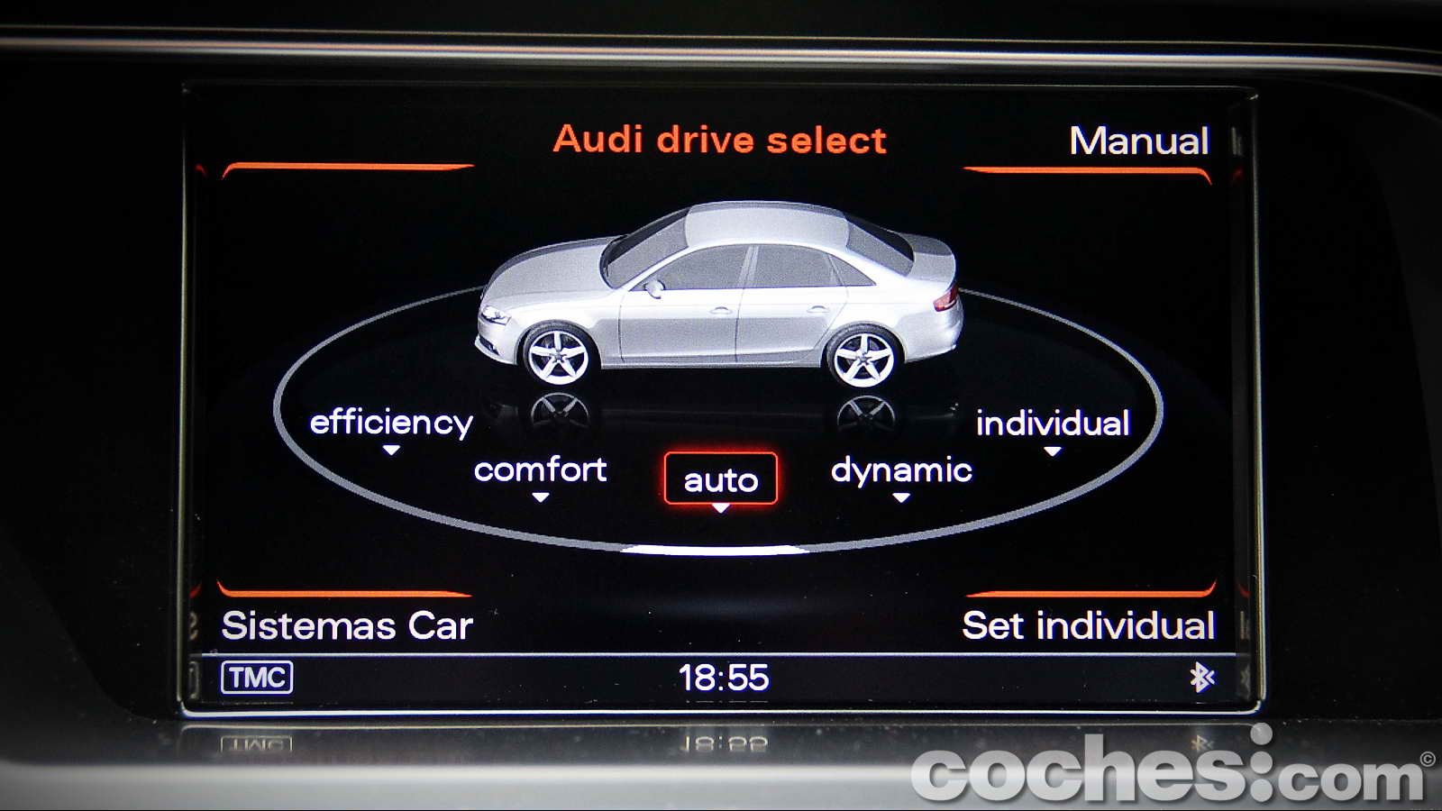 Justo debajo los aireadores centrales dan paso al cargador de CD´s del sistema multimedia y a los mandos que controlan el Drive Select (con sus diferentes modos de conducción: comfort, auto, dynamic y efficiency), la inhibición del sistema Stop&Start o la desconexión del ESP.