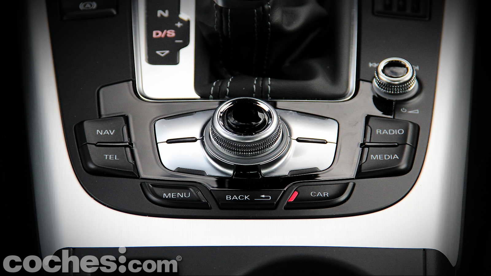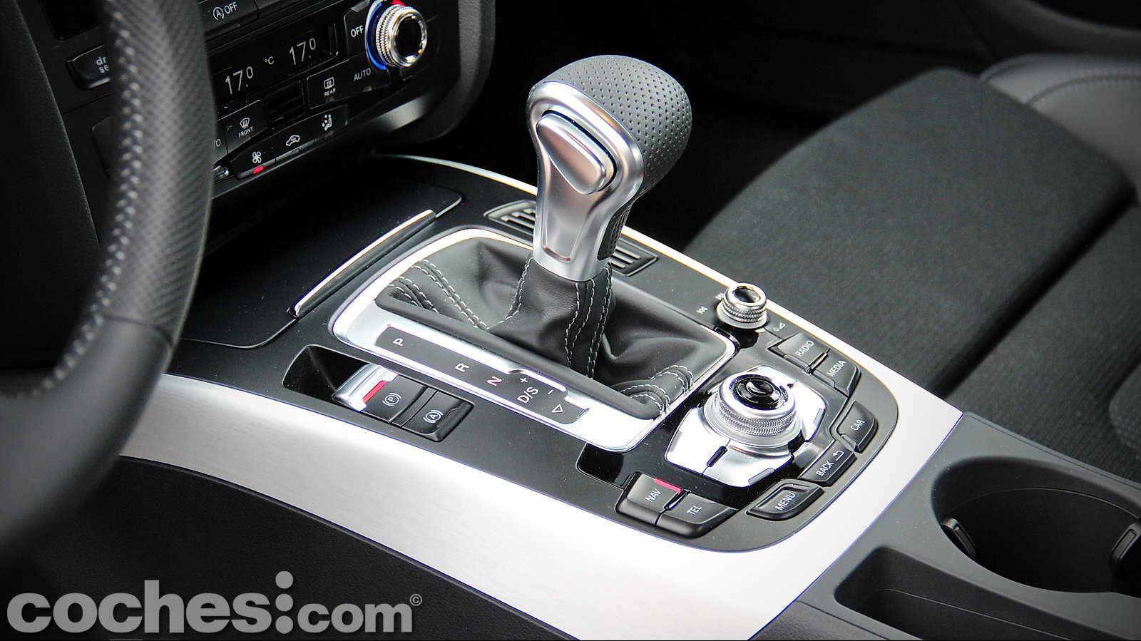 En la consola central nos encontramos con la prominente palanca de la caja de cambios Multitronic de 8 velocidades. Su pomo nos ofrece unas curiosas formas que, finalmente, resultan cómodas adaptándose perfectamente a nuestra mano. Está rodeada del mando giratorio del MMI (Multi Media Interface) con joystick integrado, del botón que acciona el freno de estacionamiento automático, del pulsador de arranque/parada del motor y del que nos permite manejar el sistema de audio.