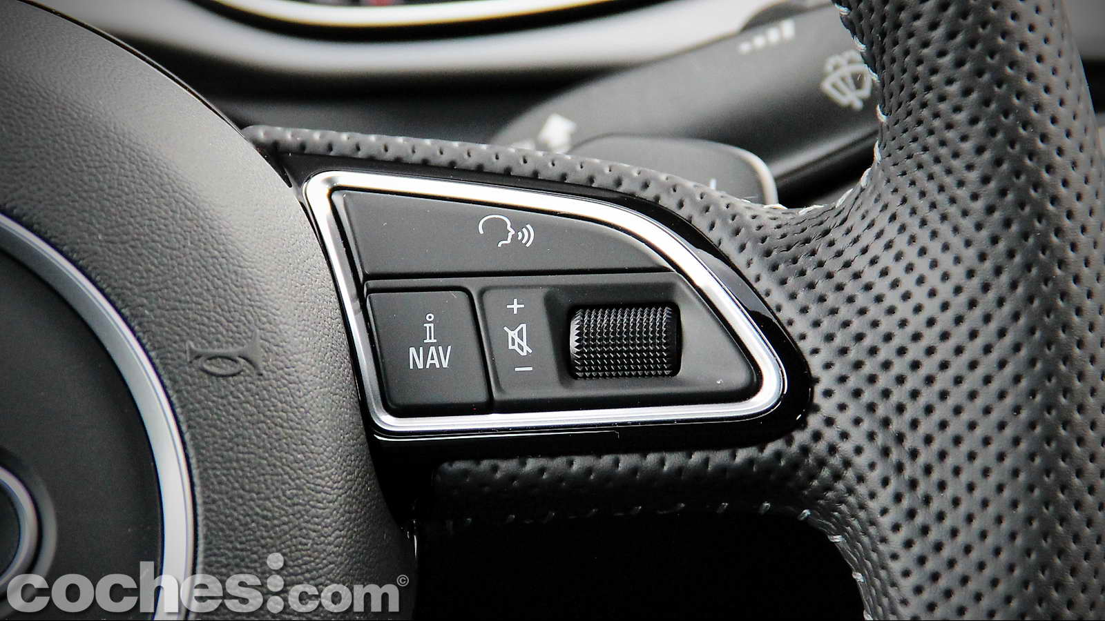 Cuenta con diversos mandos en sus brazos horizontales desde los que se controla el equipo multimedia, el teléfono Bluetooth o los diferentes modos a mostrar en la pantalla multifunción. Justo detrás se ubican las levas del cambio Multitronic de 8 velocidades por si no queremos dejar el control del mismo a los programas preestablecidos y accionarlas manualmente. Su tamaño un poco escaso, como es norma en la casa. También podemos encontrar las palancas que controlan los limpiaparabrisas, intermitentes y luces además de la que gestiona el regulador/limitador de velocidad.
