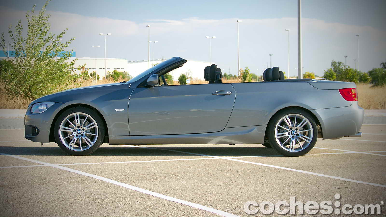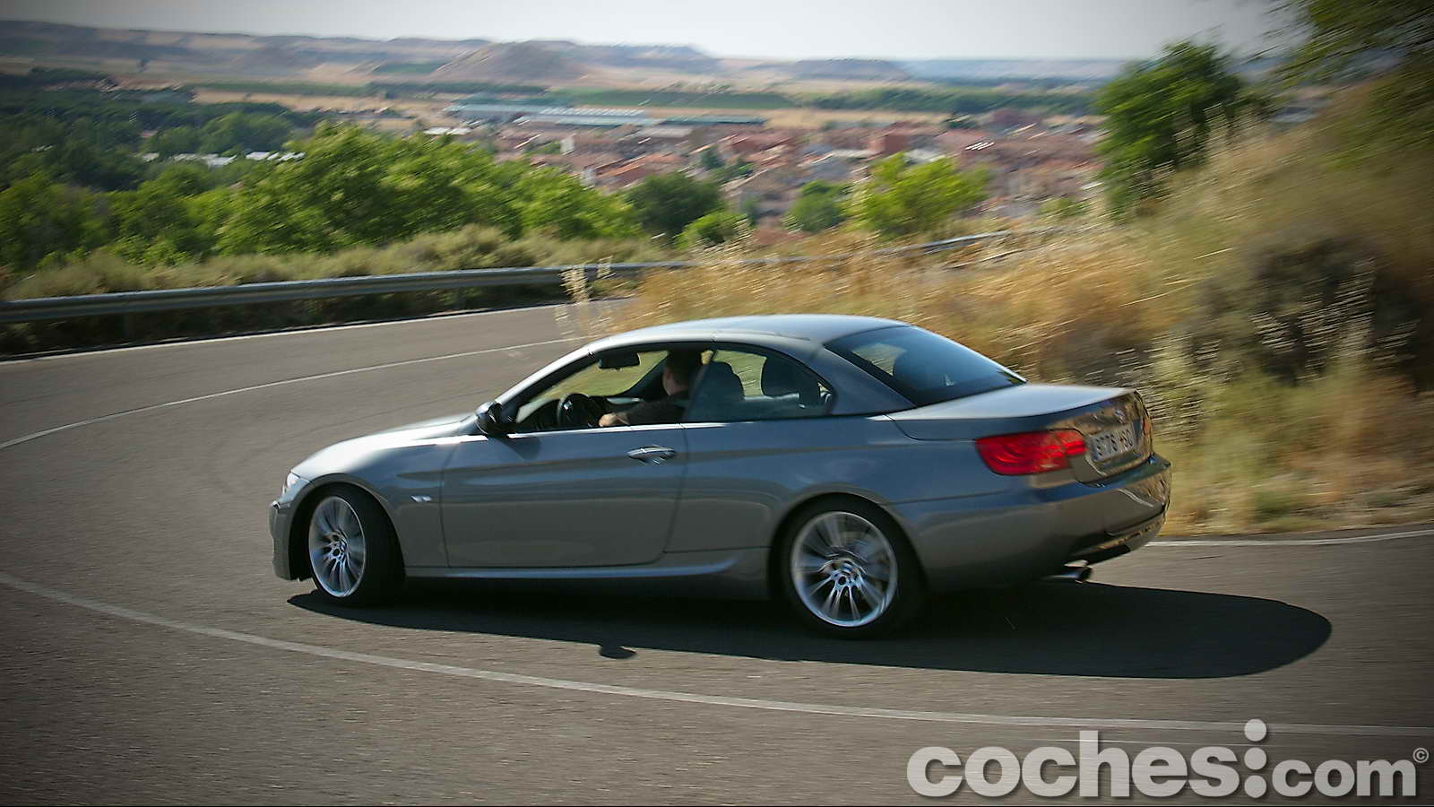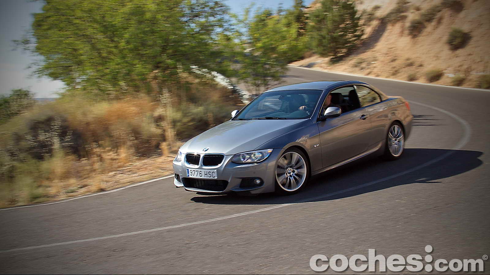 Si tenemos que realizar un viaje por vías de alta velocidad apenas notaremos diferencias con cualquiera del resto de berlinas de la firma bávara. La insonorización de la cubierta está magníficamente conseguida, con un nivel de ruido aerodinámico realmente bajo, de tal forma que si nuestros acompañantes no se han percatado de que se han subido a un descapotable quedarán gratamente sorprendidos cuando así se lo indiquemos. Moviéndonos por autovías y autopistas podremos mantener sobradamente cruceros legales o realizar fulgurantes maniobras de adelantamiento gracias al cambio automático y al voluntarioso propulsor.