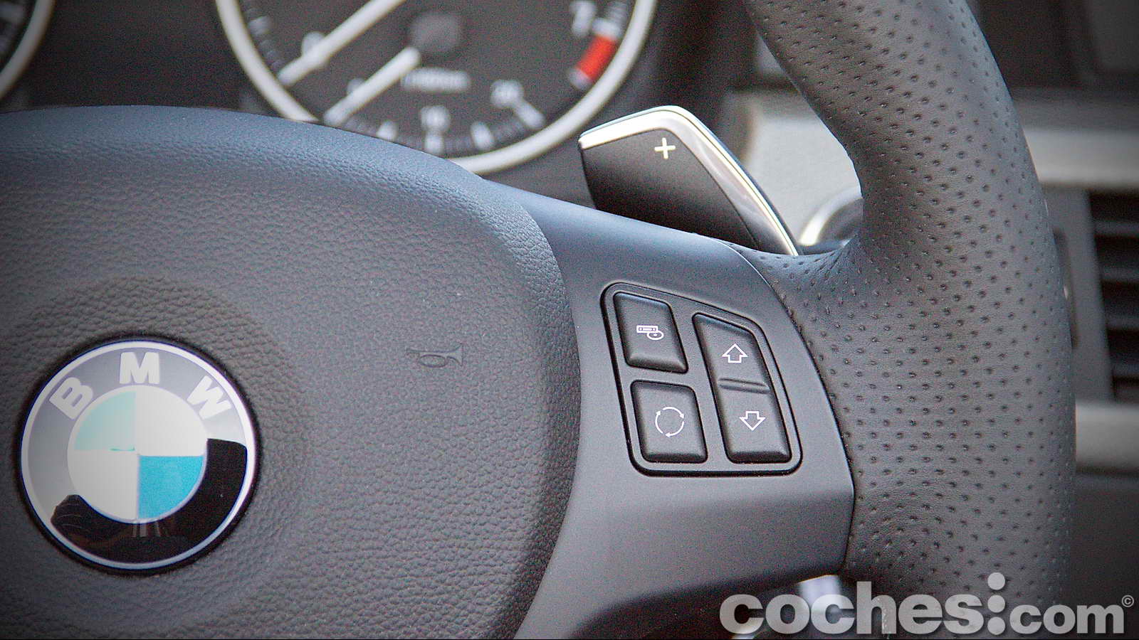 También podemos realizar una conducción más dinámica, simplemente deberemos entonces mover la palanca de cambios hacia nuestra izquierda, seleccionando el Modo Sport, y a partir de esos momentos realizaremos los cambios desde las levas situadas detrás del volante. Podremos subir y bajar marchas en el momento que queramos con transiciones suaves y sin vacíos de potencia. Si queremos ir un paso más allá entonces este cambio automático muestra sus limitaciones, no siendo equiparable a uno de doble embrague (sólo disponible en el 335i). Por lo que respecta a suspensiones y frenos no tendremos el más mínimo problema. Las primeras sujetan firmemente el coche, por muy pasados que entremos en las curvas, sin que por ello se muestren incómodas (a pesar de haberse rebajado 15 mm sobre la estándar). Los frenos aguantan todas nuestras solicitaciones de forma sobrada acompañados por unos neumáticos de excelente agarre.