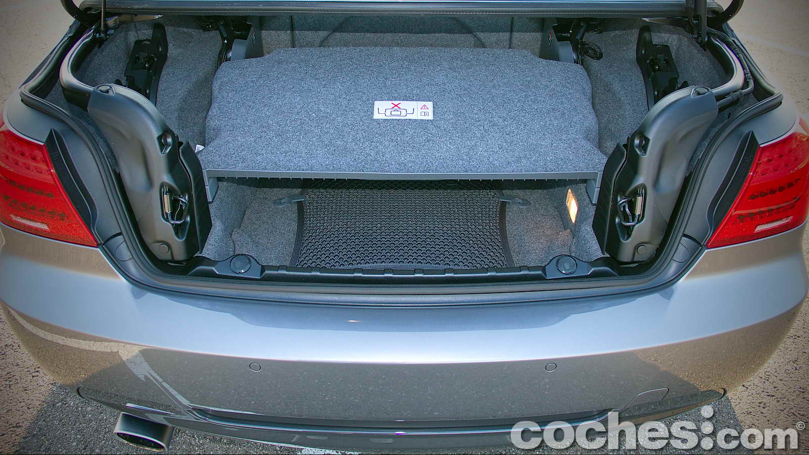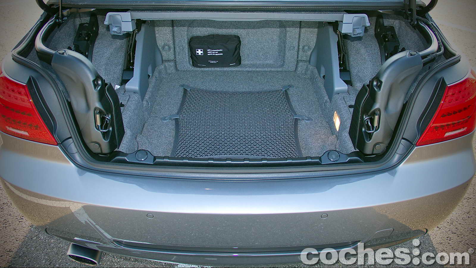 Cuando se circula con el techo puesto el volumen total del maletero es francamente aceptable, nada del otro mundo, pero aceptable, con unas formas bastante regulares y una capacidad que llega hasta los 350 litros, suficiente para los cuatro ocupantes, si utilizamos todas sus posibilidades, lo cual implica no poder abrir el techo en ningún momento. Si por el contrario circulamos descapotados o pensamos hacerlo en algún momento de nuestro desplazamiento tendremos que extender previamente una tapa deslizante que servirá de límite para saber hasta dónde podemos cargar el maletero y de esta forma no interferir con el techo plegado. Consecuentemente la capacidad de almacenaje se ve notablemente reducida, hasta los 210 litros, y ello significa que deberemos llevar tan sólo lo imprescindible para cuatro ocupantes o algo más si únicamente viajan dos personas. De hecho en BMW, que piensan en todo, han diseñado un juego de maletas específicas de cabina de avión (a 102 € la unidad) para aprovechar al máximo dicho espacio. Si éstas no fueran suficientes existe la posibilidad de adquirir otras dos maletas junto con dos bolsas pequeñas que se adaptan a la perfección a las formas de los asientos traseros y que disponen de correas de seguridad para evitar su deslizamiento (651 € el juego).