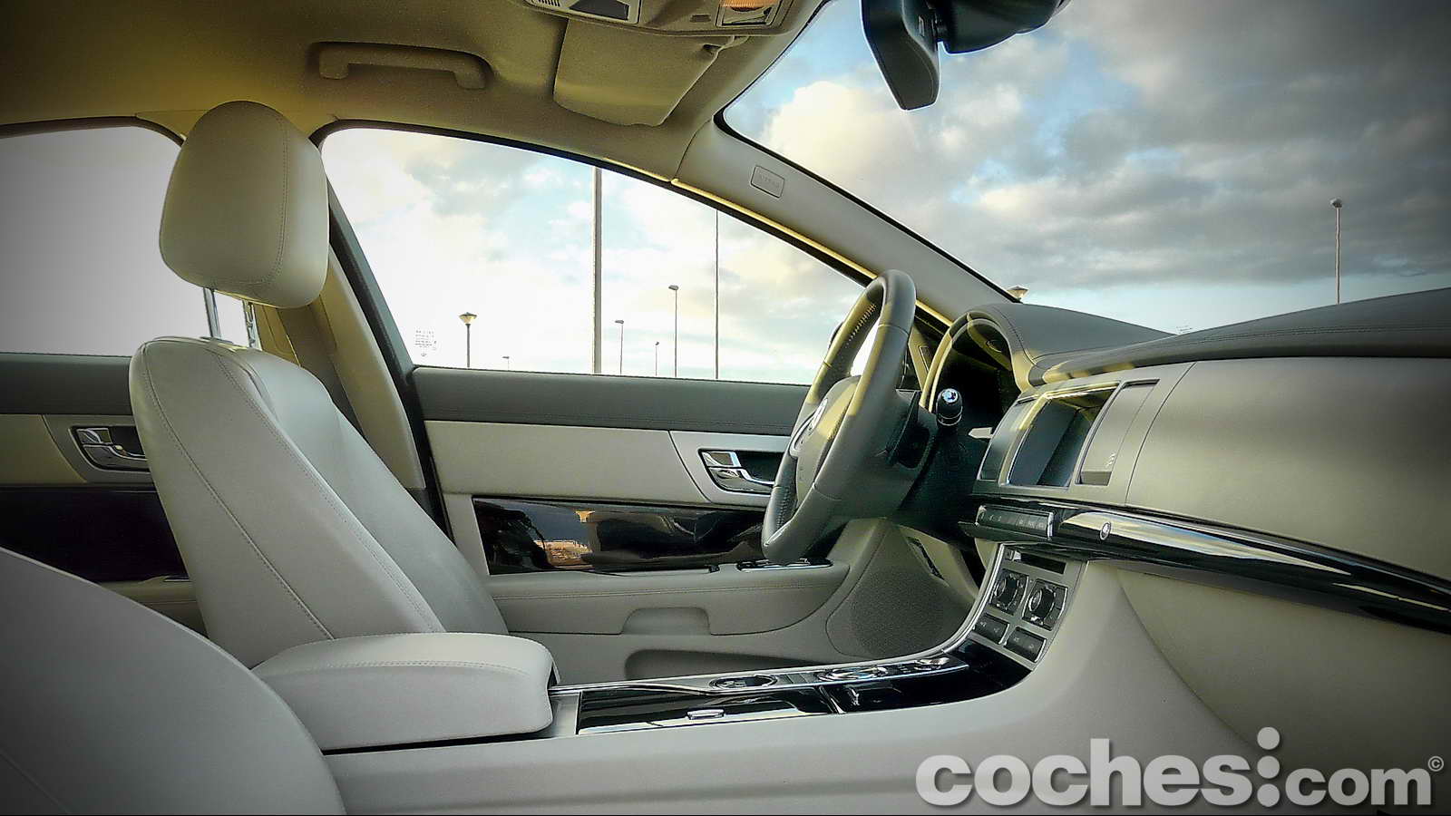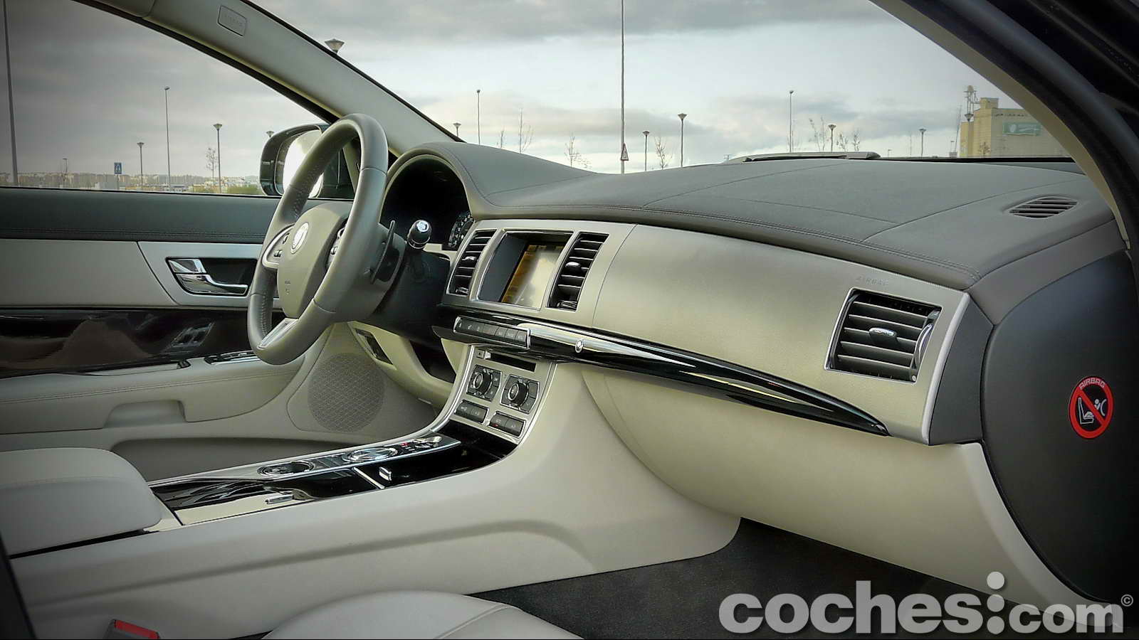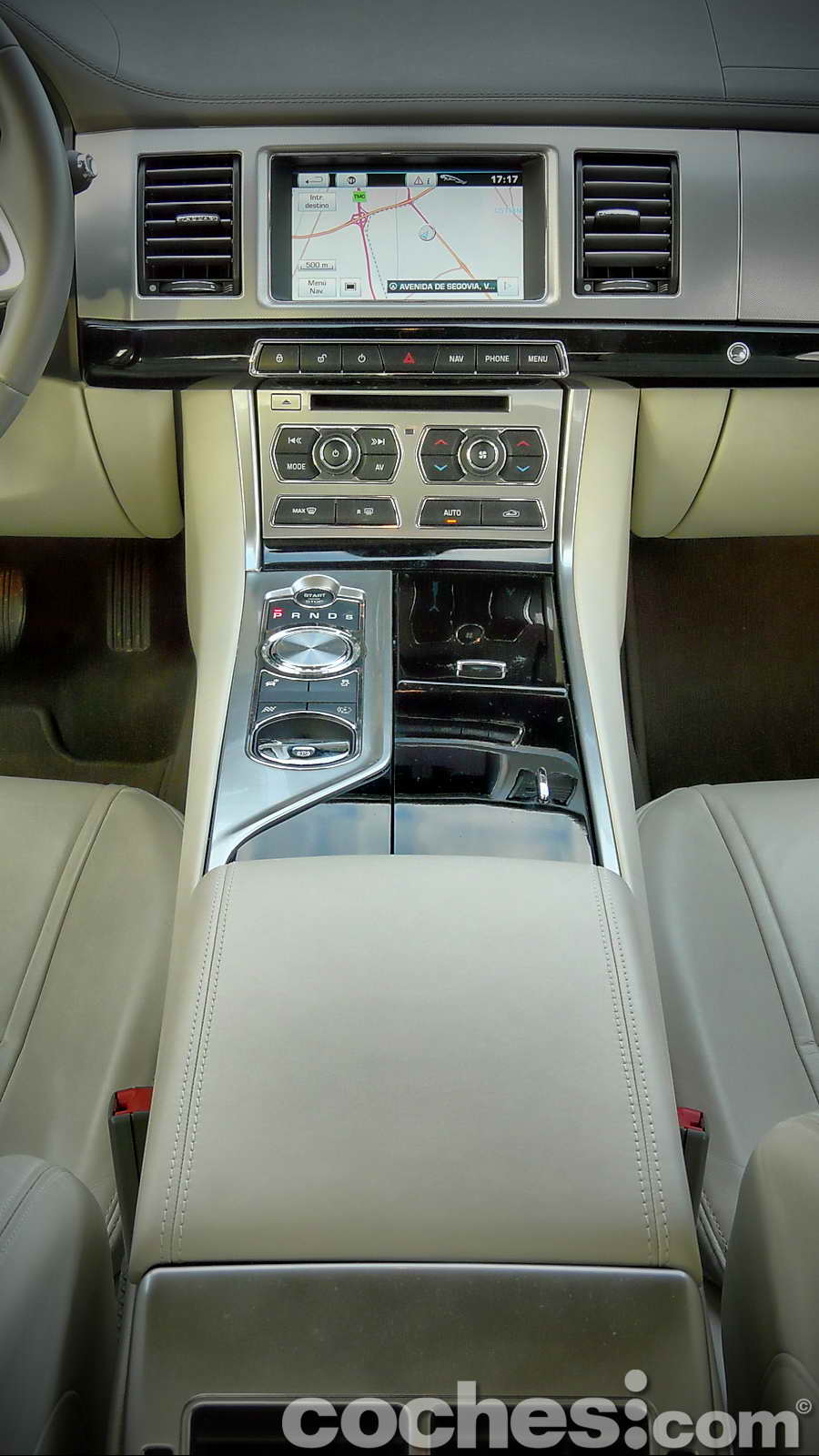 Si atractivo resulta el exterior, no lo es menos una vez abrimos las puertas y tenemos acceso a su interior, donde la firma británica muestra todo su “saber hacer”, con soluciones tan originales como las tomas de aire o el selector de cambios ocultos y que sólo aparecen cuando se arranca el vehículo. La calidad de realización es impecable, sin duda a la altura de sus rivales germanos. Todo es agradable a la vista y al tacto, desde los detalles cromados, hasta las pieles tratadas por los mejores artesanos de la firma, sin descuidar por ello el aspecto más tecnológico, con sensores que activan las luces de lectura o una enorme pantalla táctil a color de 7 pulgadas (similar a la que ya vimos en el Range Rover Evoque), desde la que se controla todo el sistema de infoentretenimiento (audio, navegador, bluetooth, cámara de marcha atrás, etc.), de gran calidad visual, aunque la transición entre los diferentes menús es un tanto lenta y no acorde con lo que uno espera en una berlina de lujo como ésta.