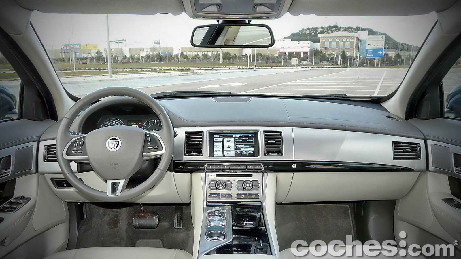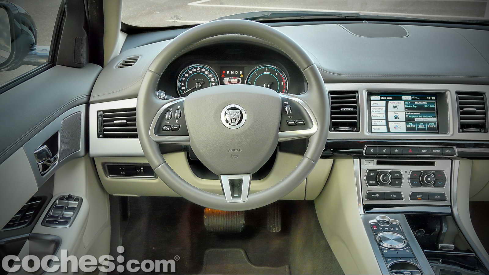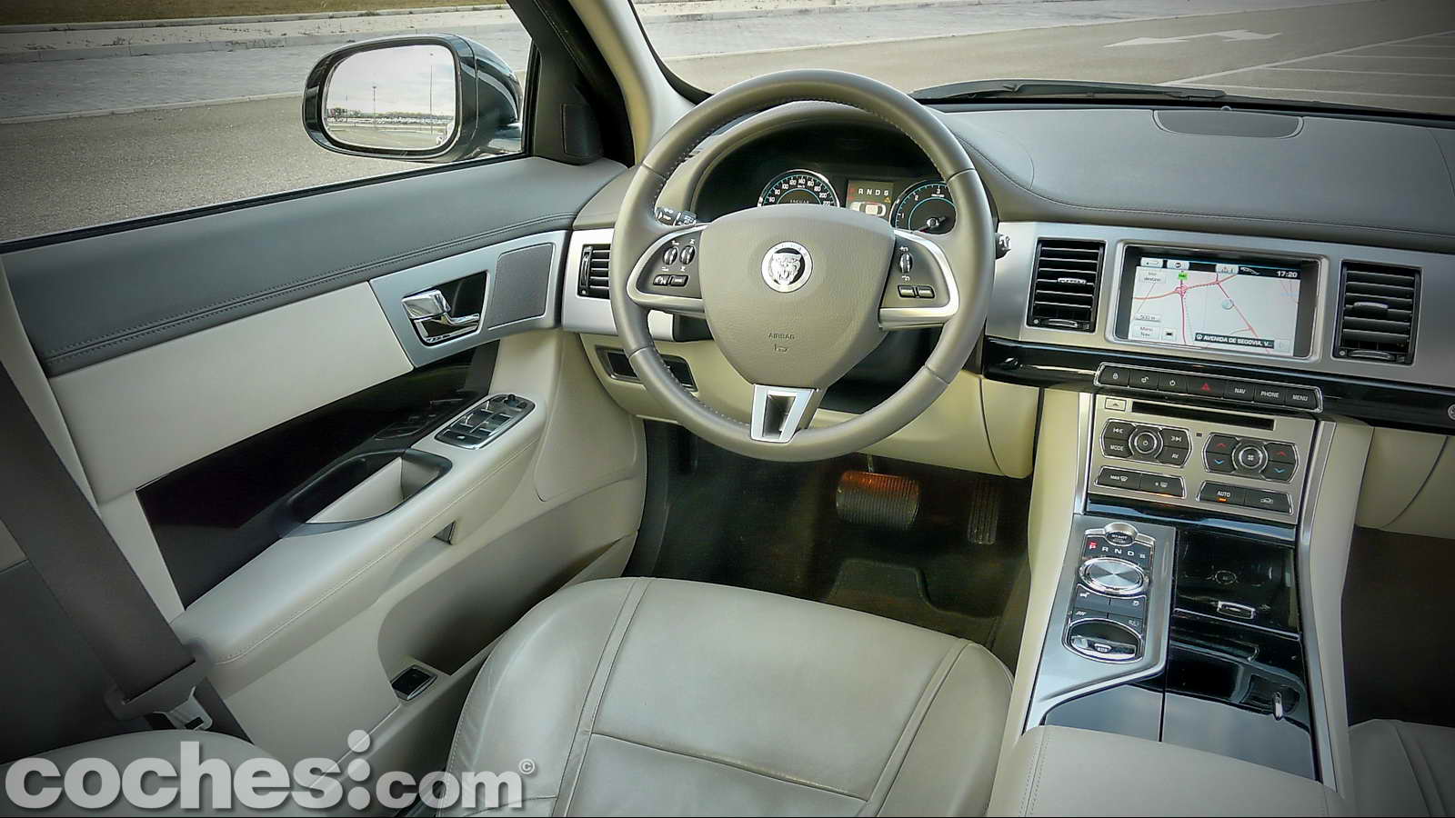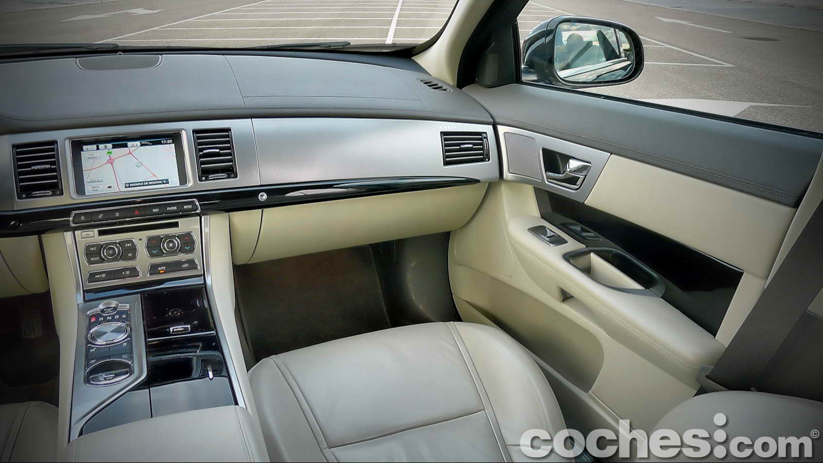 Si atractivo resulta el exterior, no lo es menos una vez abrimos las puertas y tenemos acceso a su interior, donde la firma británica muestra todo su “saber hacer”, con soluciones tan originales como las tomas de aire o el selector de cambios ocultos y que sólo aparecen cuando se arranca el vehículo. La calidad de realización es impecable, sin duda a la altura de sus rivales germanos. Todo es agradable a la vista y al tacto, desde los detalles cromados, hasta las pieles tratadas por los mejores artesanos de la firma, sin descuidar por ello el aspecto más tecnológico, con sensores que activan las luces de lectura o una enorme pantalla táctil a color de 7 pulgadas (similar a la que ya vimos en el Range Rover Evoque), desde la que se controla todo el sistema de infoentretenimiento (audio, navegador, bluetooth, cámara de marcha atrás, etc.), de gran calidad visual, aunque la transición entre los diferentes menús es un tanto lenta y no acorde con lo que uno espera en una berlina de lujo como ésta.