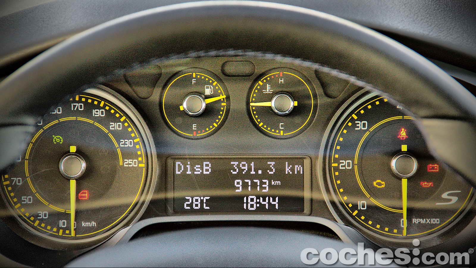 El cuadro de relojes está compuesto por cuatro elementos redondos, dos de grandes dimensiones destinados a las típicas funciones de cuentarrevoluciones y velocímetro y dos más pequeños que nos informan del nivel de combustible y de la temperatura del agua. Sus grafías parecen tener un sabor añejo pero es que se ha buscado intencionadamente para que se parezcan a la de los míticos Lancia Delta HF Integrale, mencionados al comienzo de este artículo.