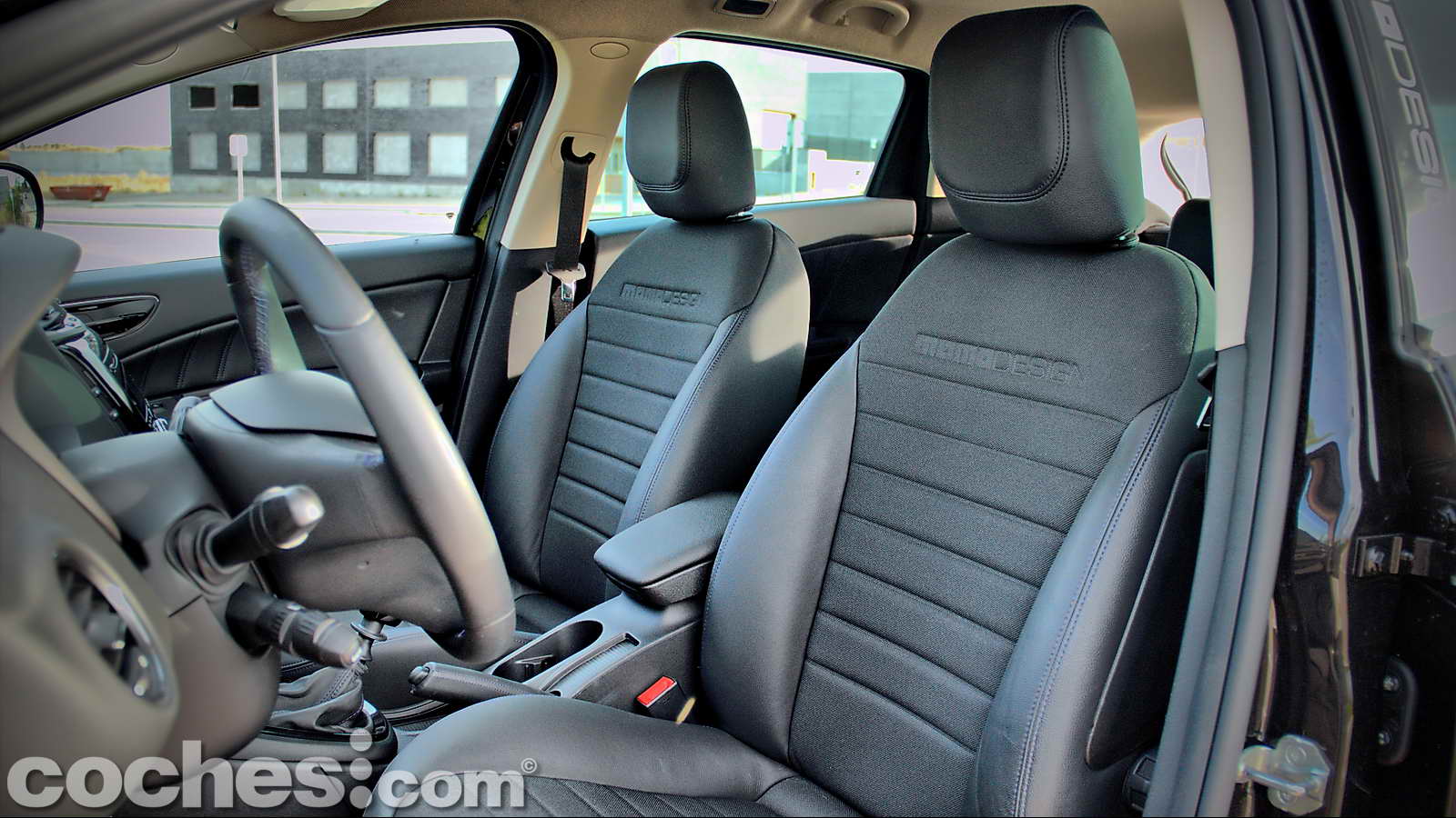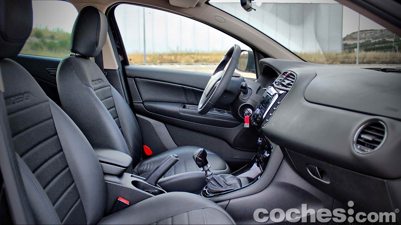 En el interior también sale a relucir el trabajo realizado por la firma de Turín junto a MOMODESIGN, aunque resulta mucho menos singular que el exterior. Todos los elementos son viejos conocidos de la marca y el pretendido ambiente Premium solamente se ha logrado en parte. Es cierto que la calidad de algunos materiales raya a buena altura, pero no podemos decir lo mismo de otros o de ciertos ajustes. Por ejemplo se mezclan plásticos blandos de buen tacto en algunas zonas con otros duros y de acabado muy tosco en otras, que rebajan sustancialmente la sensación de calidad percibida.