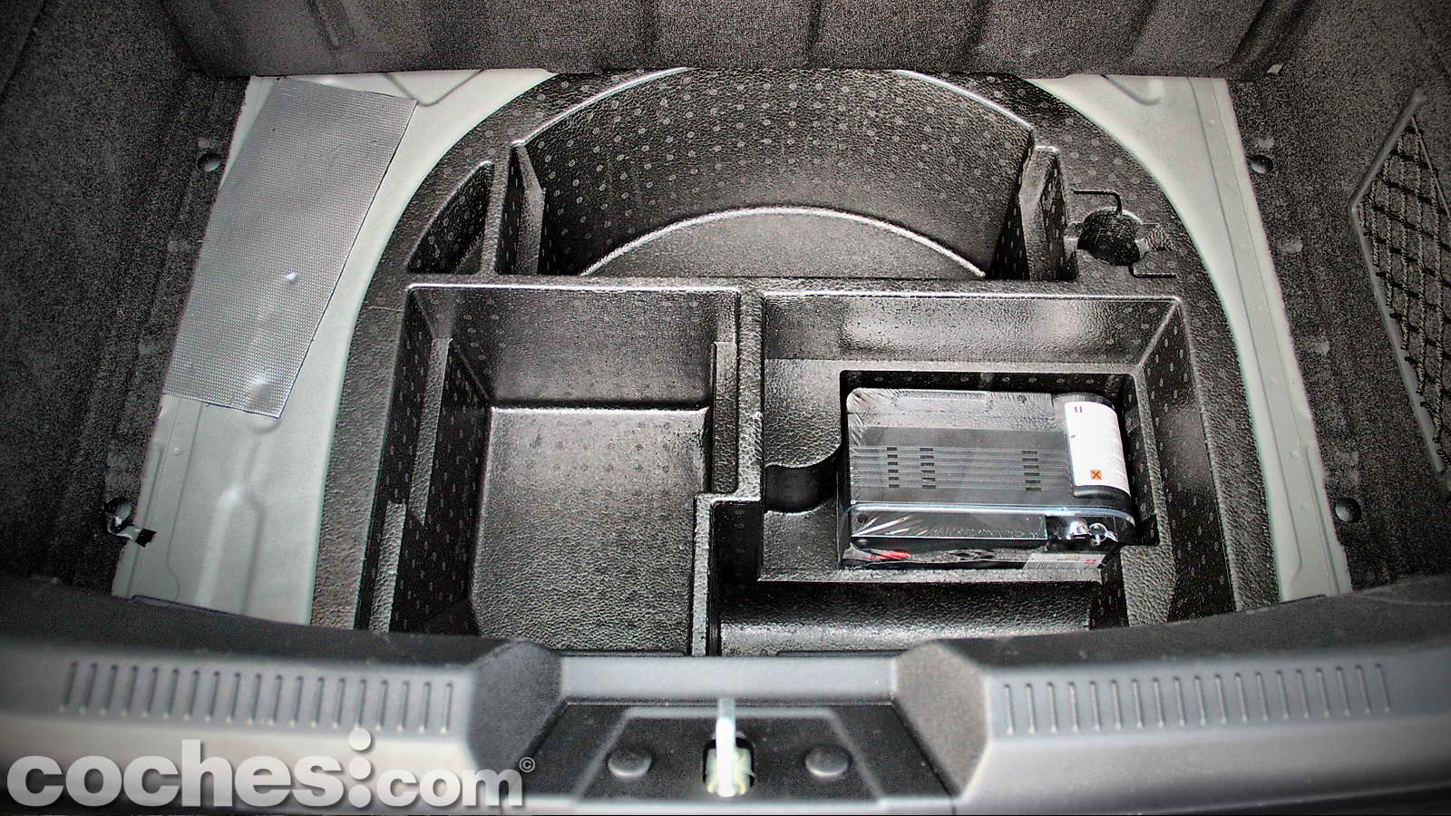 Debajo del plano de carga, a pesar de haber suficiente espacio para una rueda de repuesto, ésta se sustituye por el sempiterno kit reparapinchazos y un compresor, dejando un hueco compartimentado donde esconder de miradas ajenas pequeños objetos.