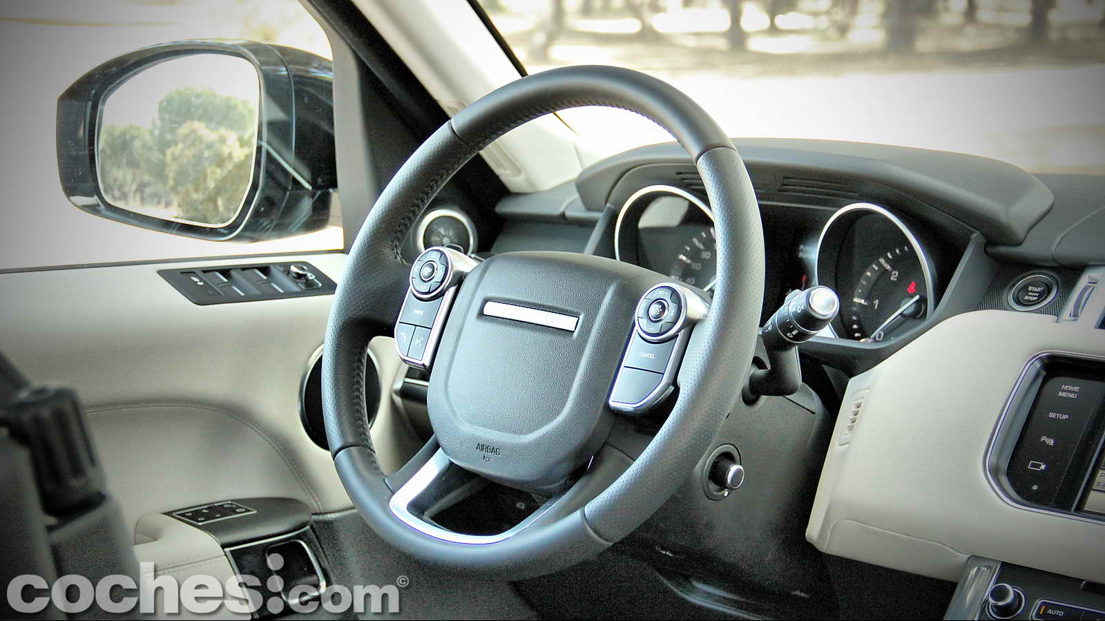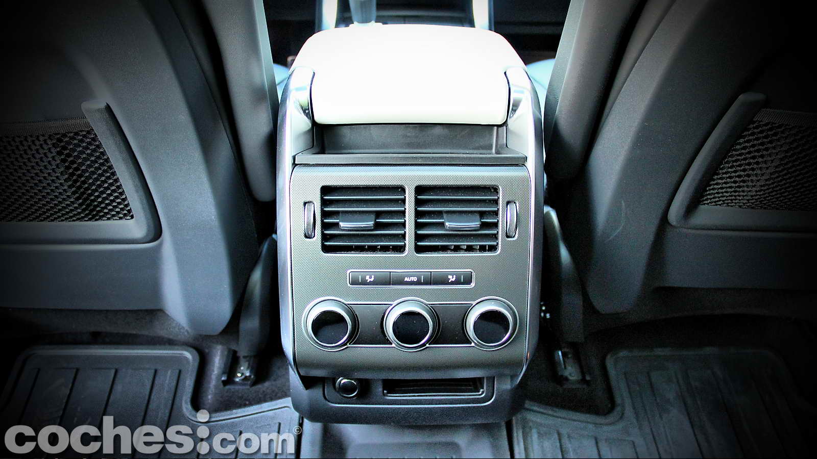 A continuación se sitúa el mando, esta vez sí giratorio, de control del sistema Terrain Response 2 que, como veremos más adelante, gestiona automáticamente el modo de tracción más indicado para cada tipo de terreno. Junto a él encontramos el mando de la suspensión neumática con el que podremos controlar la altura de la carrocería a la hora de afrontar los terrenos más complicados. Mientras que a la derecha de esta zona disponemos de una pequeña guantera, con una tapa deslizante para ocultar lo que guardemos en su interior.