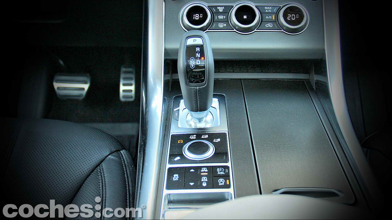 Muy a mano, y sobre el túnel central encontramos la palanca que gobierna el cambio automático de 8 velocidades, de origen ZF. Es de agradecer su presencia en un vehículo más deportivo que sus hermanos de gama, frente a la ruleta ya conocida (compartida también con algunos modelos de Jaguar), permitiendo elegir más rápidamente la marcha a engranar o su manejo secuencial.