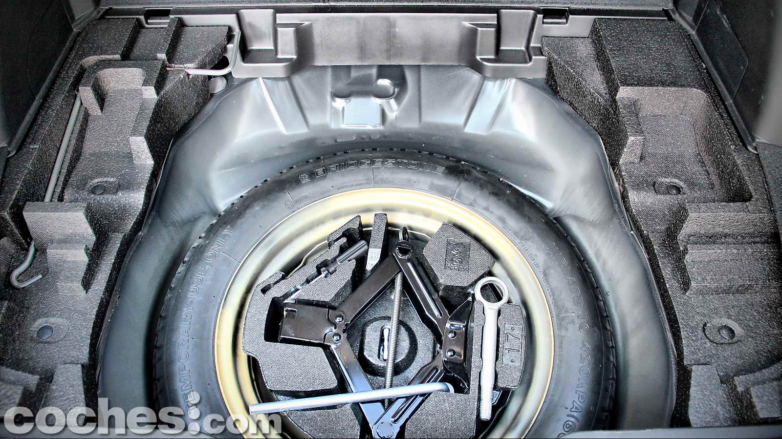 En su interior alberga el gato, gancho de remolque y las herramientas necesarias para cambiarla. Nuestra recomendación, dado que existe hueco suficiente, es adquirir una rueda de las mismas dimensiones y compuesto de las otras cuatro, sobre todo si solemos frecuentar pistas y caminos.