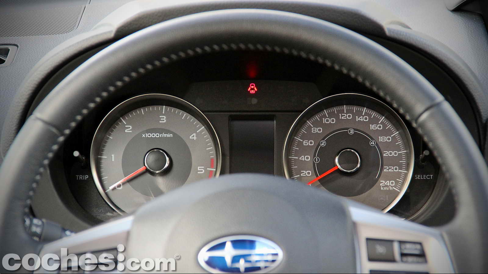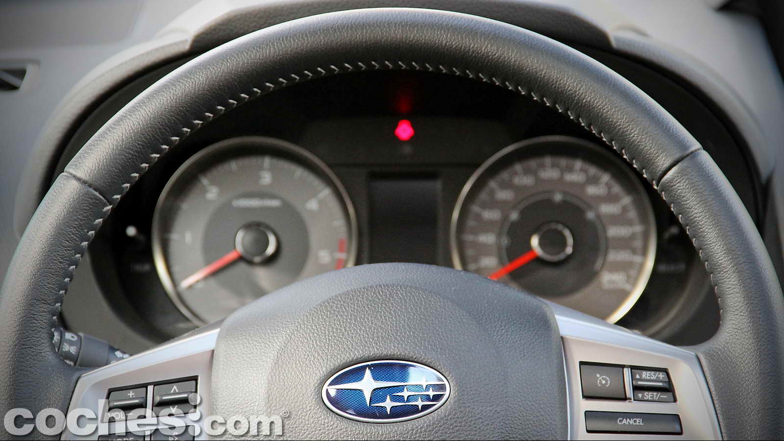 En lo que respecta al puesto de conducción está presidido por un volante de tres radios de correctas dimensiones y grosor, forrado en cuero. En los brazos horizontales, de notables dimensiones, se agrupan los mandos de control del sistema multimedia y teléfono (izquierda) y del control de crucero y limitador de velocidad (derecha). En su zona central no podía faltar el logo con las 6 estrellas de la constelación de las Pléyades, emblema de la firma nipona. El volante es regulable tanto en altura como profundidad lo que hace que, junto a los múltiples reglajes del asiento del conductor, sea bastante sencillo encontrar la postura de conducción idónea.