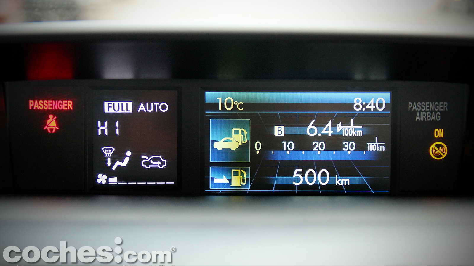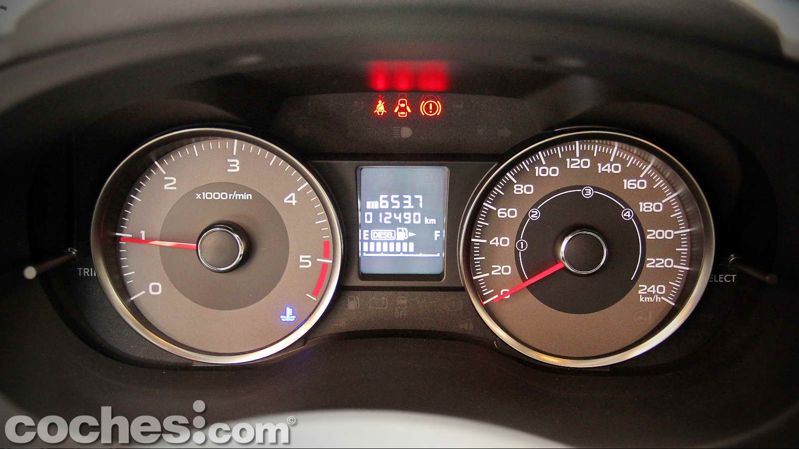 Una vez bien sentados nos resultarán claramente visibles tanto el tacómetro como el velocímetro del cuadro de relojes, así como la pequeña pantalla multifunción que hay entre ambos, donde se indican kilometrajes totales y parciales, consumos, velocidades medias, etc. También encontramos algunos mandos más concentrados en la zona izquierda de la columna de dirección, como son los de la regulación de la intensidad lumínica del cuadro, desconectador del ESP o apertura del portón trasero.