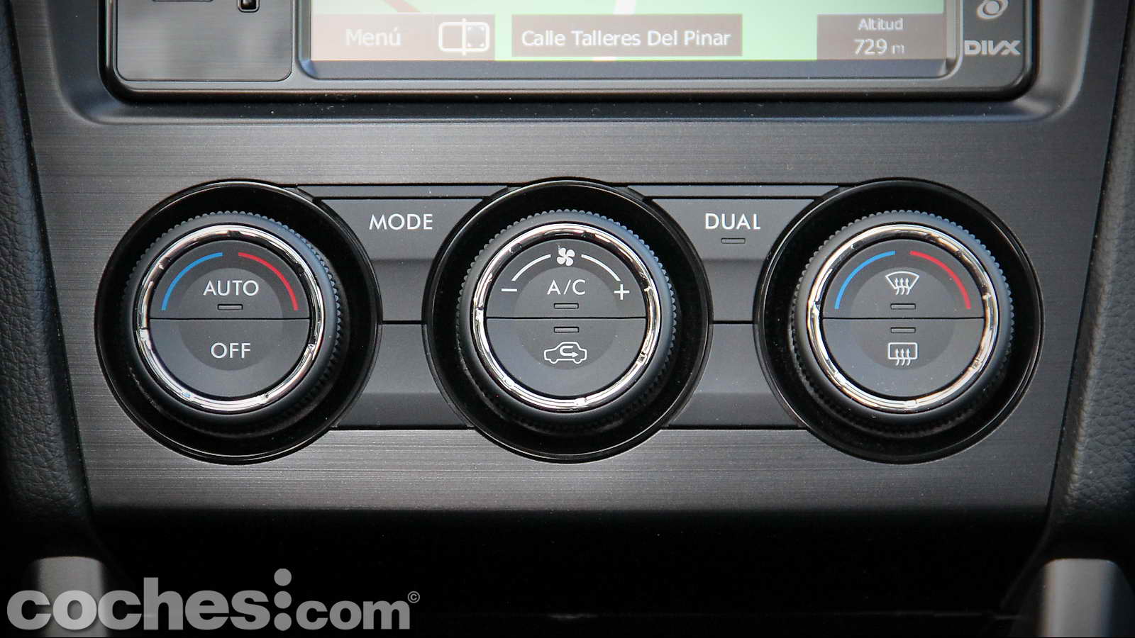 Tres grandes mandos giratorios sirven para regular el sistema de climatización bi-zona, que cuenta con una buena potencia y permite alcanzar la temperatura óptima en pocos instantes, a pesar del gran volumen de aire que aloja este SUV japonés.