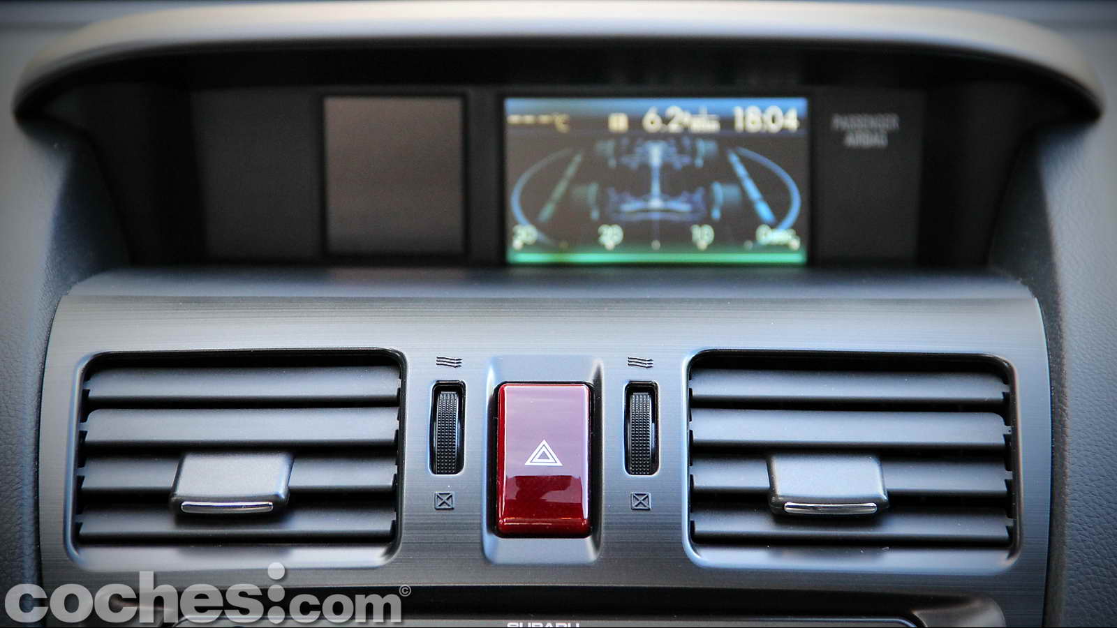 Justo debajo encontramos un par de aireadores rectangulares de fácil regulación y orientación, rodeando el pulsador de los intermitentes de emergencia, de unas considerables proporciones, todo lo contrario a lo que ocurre en muchos modelos actuales que casi tratan de esconderlo en el salpicadero.