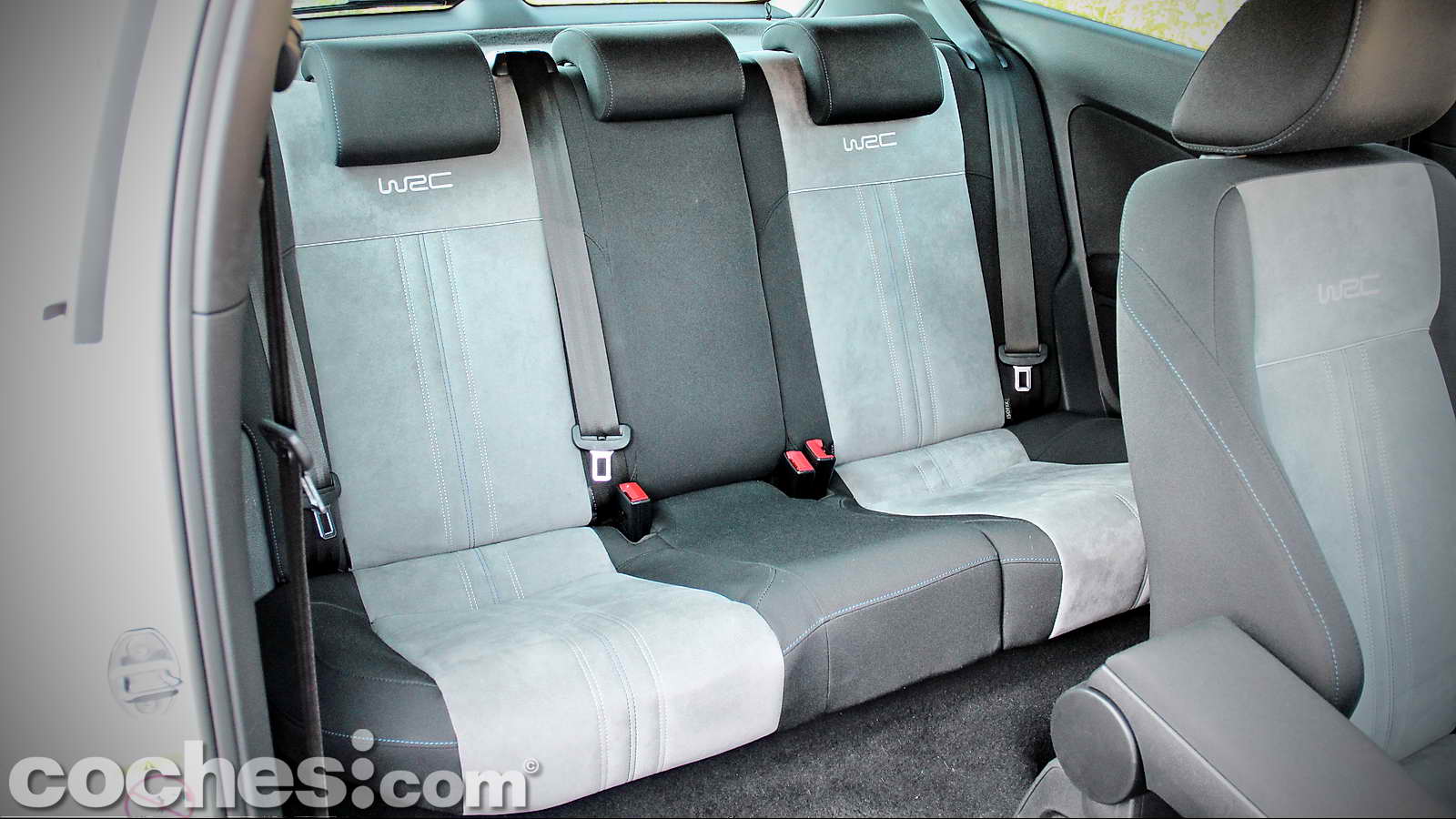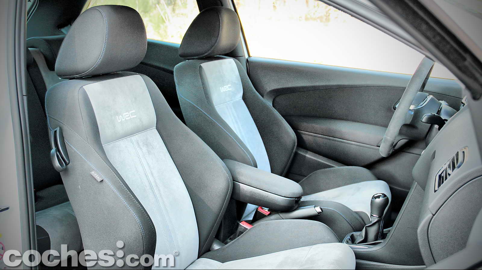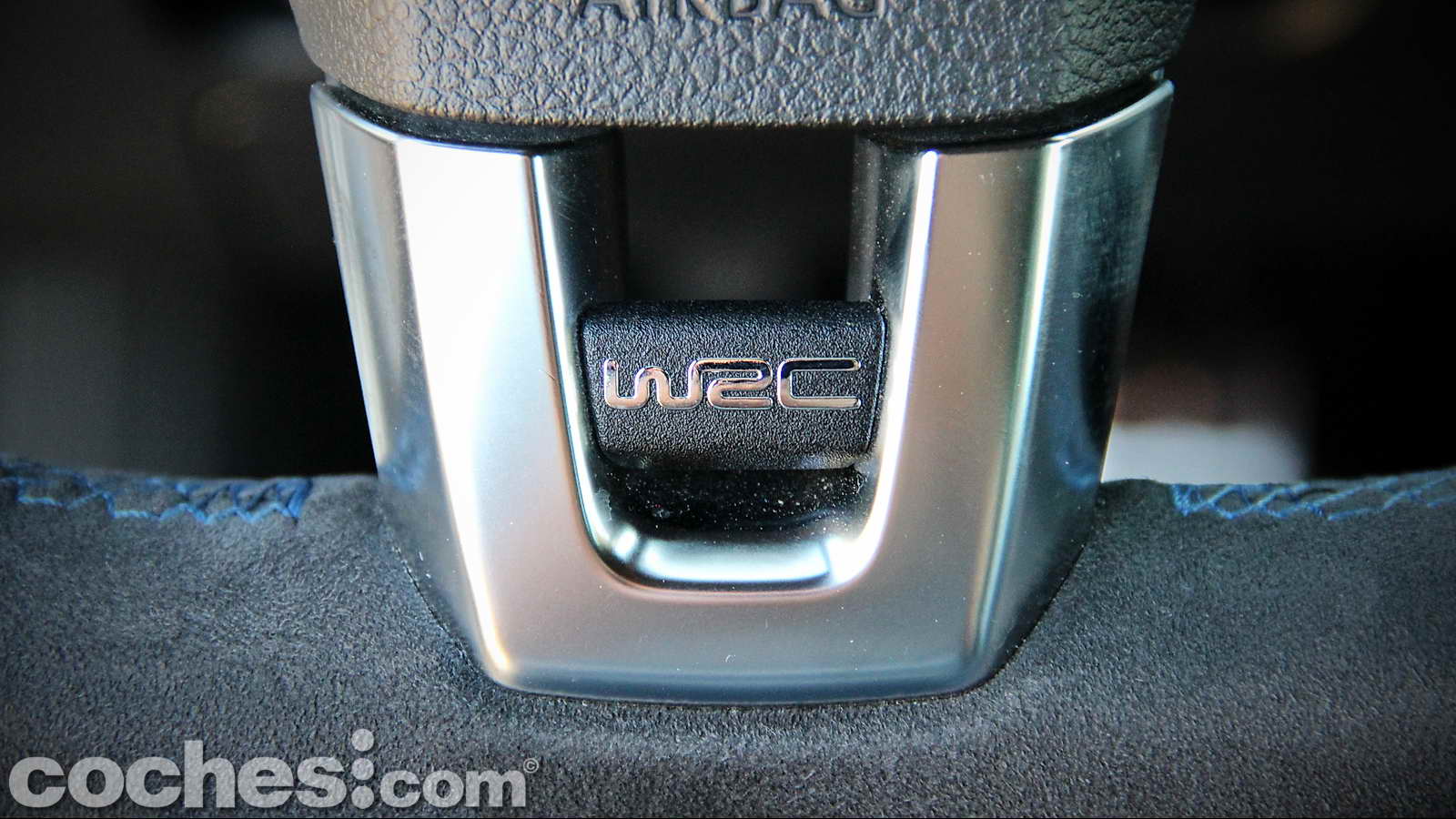No obstante nos podemos dar con un canto en los dientes pues sí que cuenta con algunos elementos exclusivos en esta serie limitada, como son: asientos deportivos tapizados parcialmente en Alcantara, con el logo WRC bordado en los respaldos; palancas de la caja de cambios y del freno de mano forradas en piel y con costuras en azul; pedalier en aluminio y, por último, un fantástico volante multifunción forrado íntegramente en Alcantara con las costuras en azul y el logo WRC incrustado en su brazo inferior, que además dispone de una marca de centrado y está ligeramente achatado en su parte inferior.