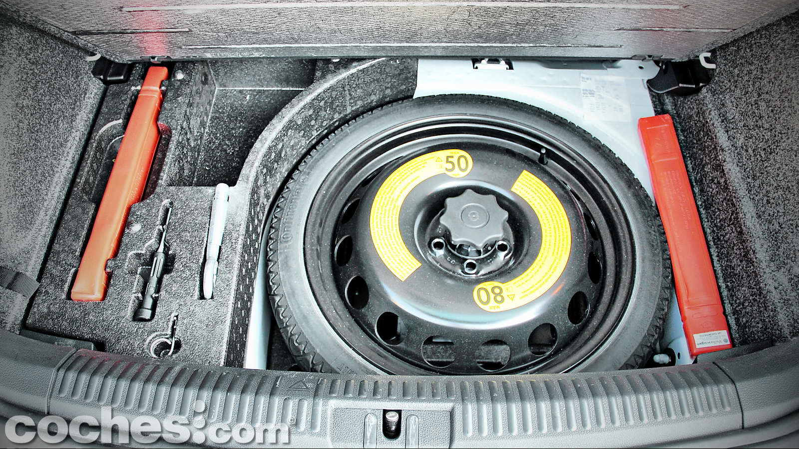 Si levantamos el panel enmoquetado que recubre el fondo del maletero encontraremos una rueda de repuesto de emergencia de uso temporal de la firma Continental en medidas T 125/60 R18 94M, así como una pequeña dotación de herramientas, los triángulos de emergencia y un hueco donde almacenar objetos de reducido volúmen (impermeable, guantes de trabajo, etc).