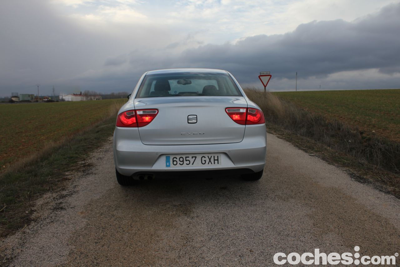 El Seat Exeo es una berlina media que mide 4,66 metros de largo, 1,77 metros de ancho y 1,43 metros de ancho. Su batalla de 2.642 mm, algo corta para su segmento, (el tamaño medio también es algo mayor). Pesa 1.505 kg. El Exeo es de esos coches que va cambiando en función de por donde lo mires. Vamos a ilustrarlo con fotos a medida que lo explicamos: