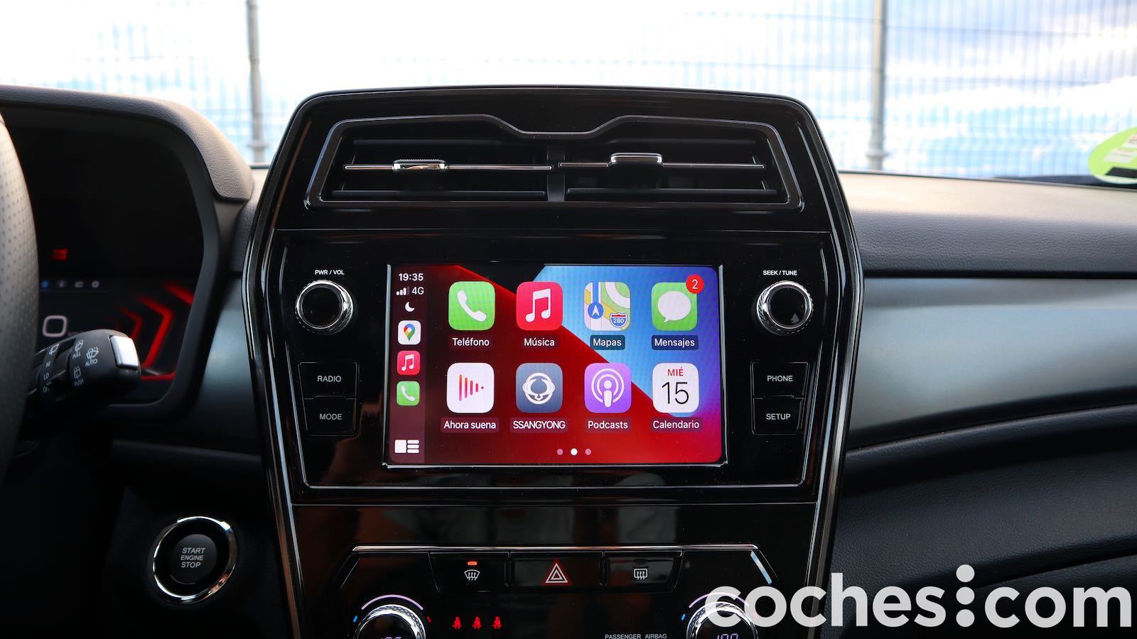 Cuando pasamos al interior nos encontramos con lo mismo que puedes ver en un Tivoli. Tanto en materiales, con bastante plástico duro, pero bien ensamblados, como en diseño. Domina la consola central una pantalla de 8 pulgadas, de un funcionamiento simple. Toda esa zona va recubierta de plástico negro brillante, un material que se ensucia y daña con bastante facilidad.