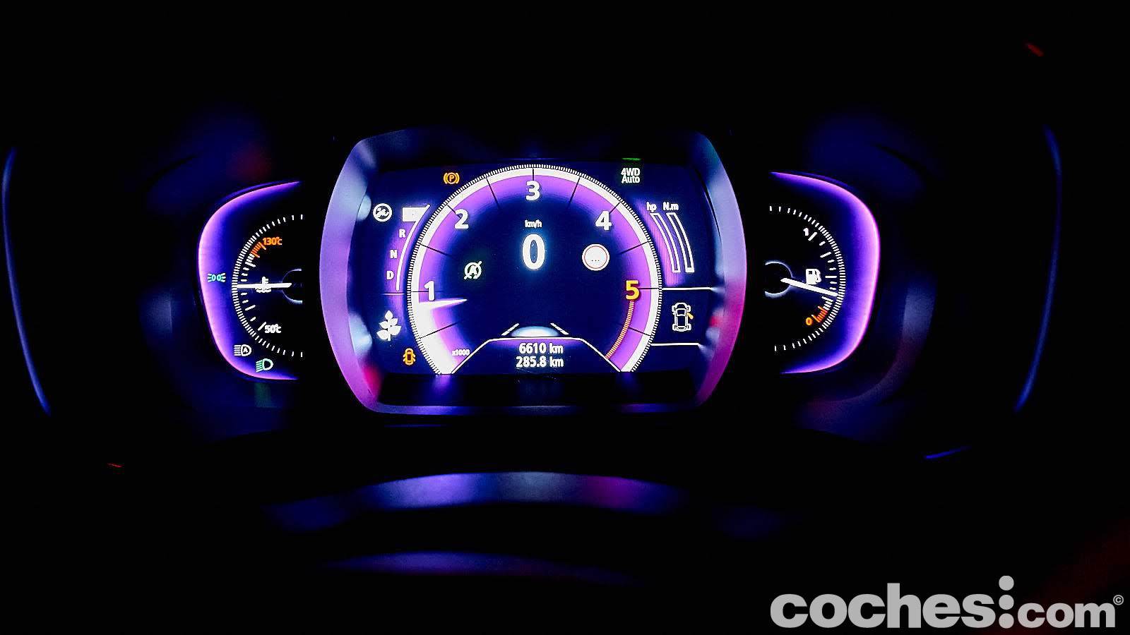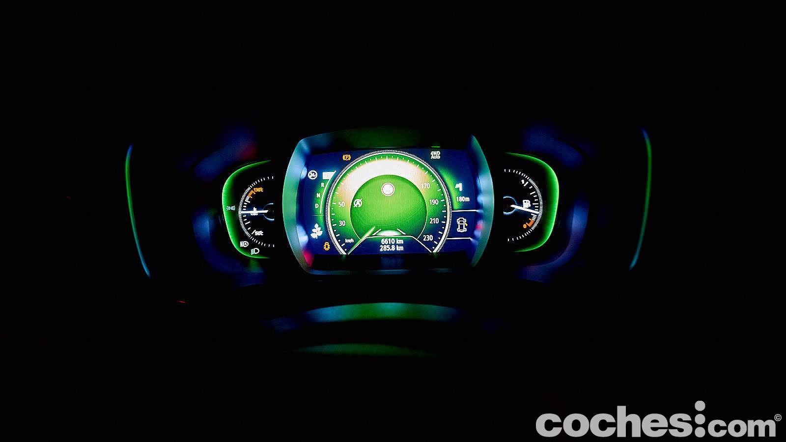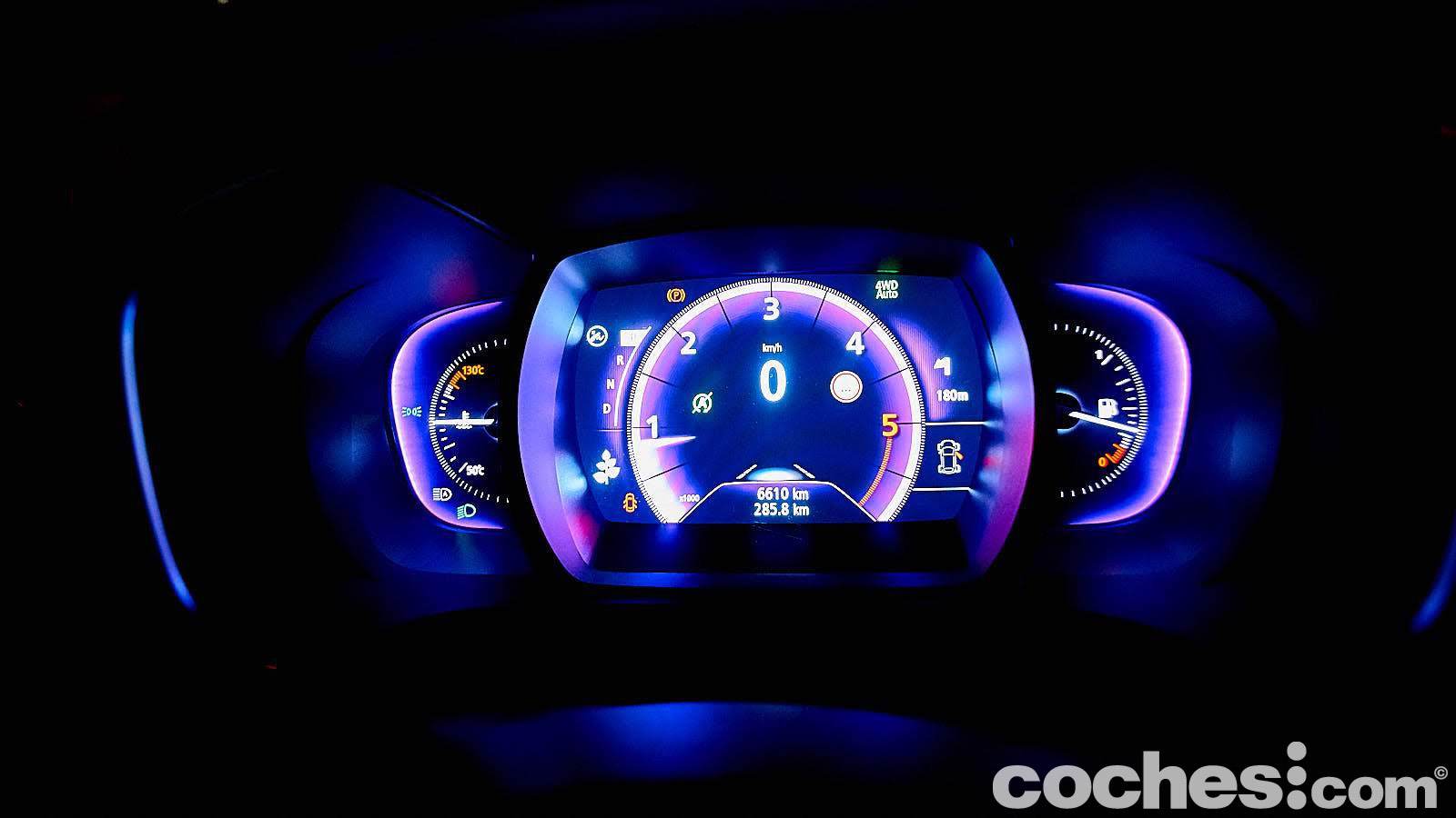 El cuadro de instrumentos está dividido en tres. En la parte central se recurre a un sistema digital que se puede personalizar con varias grafías para consultar toda la información relacionada con la conducción. A los lados se sitúan dos semicircunferencias de tipo analógico donde podemos consultar la temperatura del motor y la cantidad de combustible que nos queda. Un detalle muy francés es la posibilidad de cambiar el color de la luz del habitáculo, pudiendo elegir entre las siguientes gamas de colores: verde, azul, rojo, morado y amarillo.