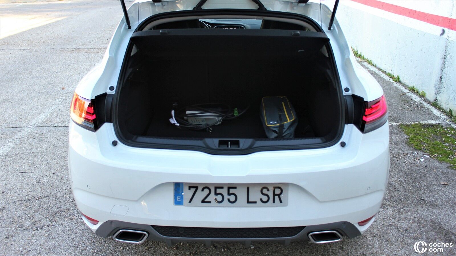 Llegamos a uno de los puntos flacos del Renault Mégane E-Tech, su maletero. La versión híbrida enchufable pierde 123 litros con respecto a cualquier otra versión de la gama Berlina. La razón la tenemos en que ahí se alojan tanto la batería como el hueco dedicado a los cables de carga. De serie, el Renault Mégane híbrido enchufable viene equipado con un cable de tipo Schuko, y en opción hay un cable Mennekes (500 euros), que sirve para conectarse a una estación WallBox o a algunos puntos de recarga públicos.