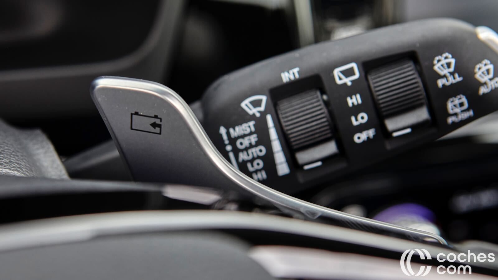 Hay una banda azul decorativa que recorre el salpicadero y llega hasta las puertas. También en el propio volante, tras el que encontramos levas para variar el nivel de retención del freno regenerativo.