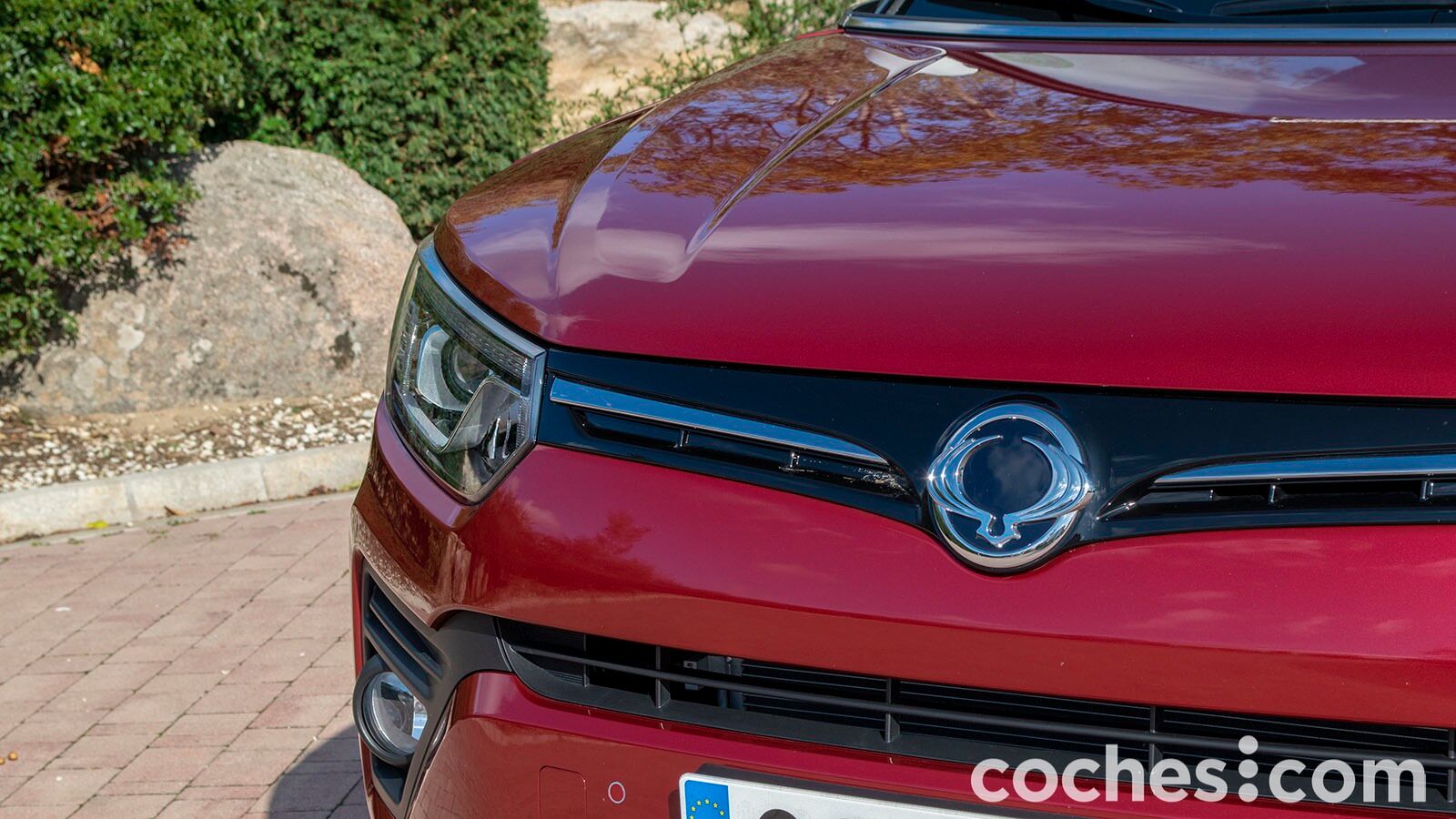 Si volvemos a la imagen del exterior, comenzaremos diciendo que el frontal sigue ese lenguaje de diseño tan característico de la marca coreana. Aparecen unos nuevos faros con luces LED diurnas que se integran en esa estrecha parrilla que tiene en el centro el logotipo del dragón alado y va surcada por un listón cromado. En la parte intermedia del paragolpes hay otra rejilla que conecta con unas molduras negras donde están unos antiniebla circulares. La parte inferior está cubierta por plástico negro.