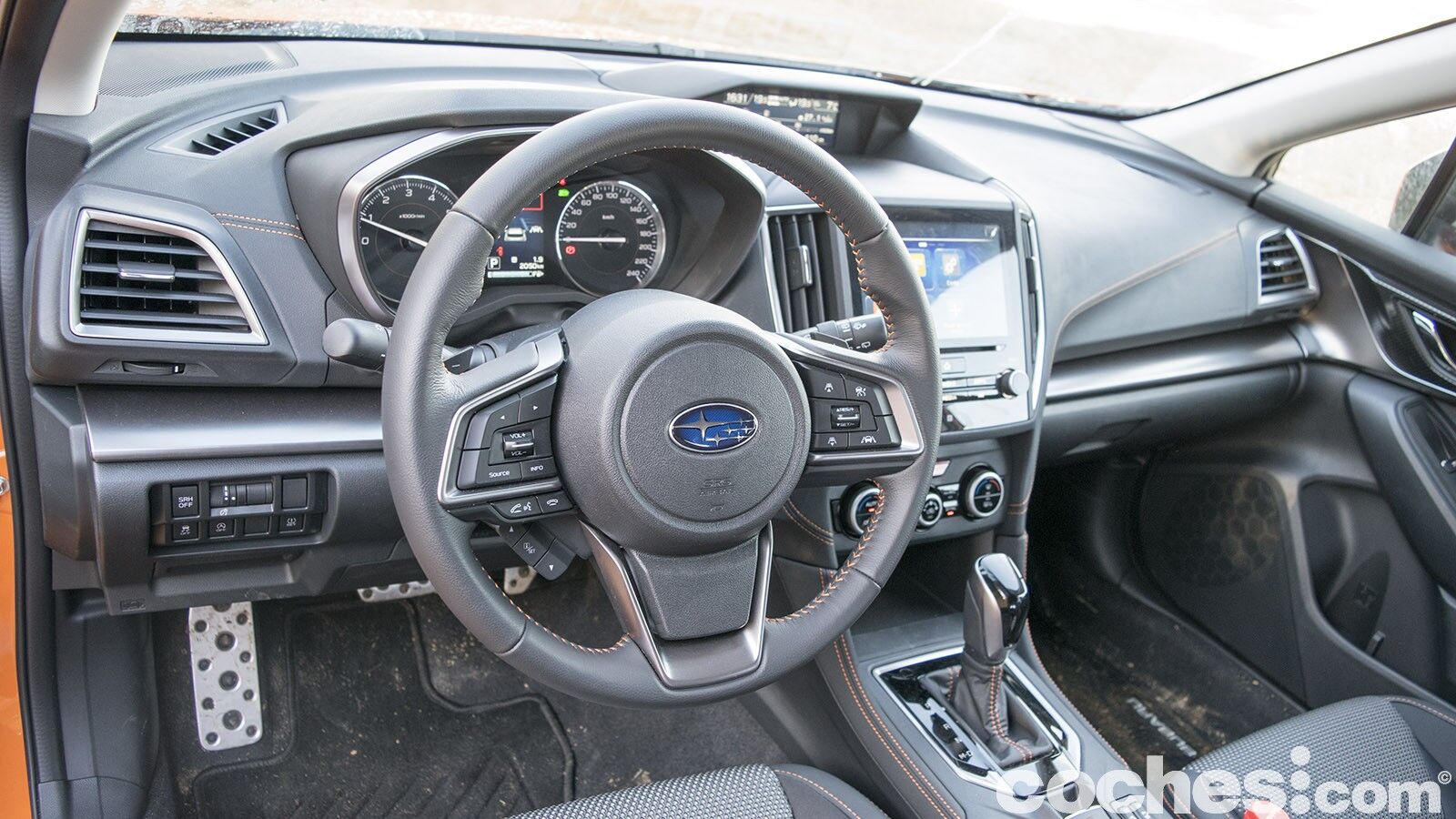 La calidad percibida es otro de los aspectos que han dado un paso adelante en el nuevo Subaru XV. En nuestro acabado Sport Plus encontramos el salpicadero cubierto por plásticos blandos con un detalle que no pasa desapercibido, las costuras naranjas en contraste. Los asientos con tapicería mixta siguen el mismo patrón y destacan por su ergonomía. Las molduras cromadas ponen otro punto de distinción a este habitáculo funcional y bien rematado.